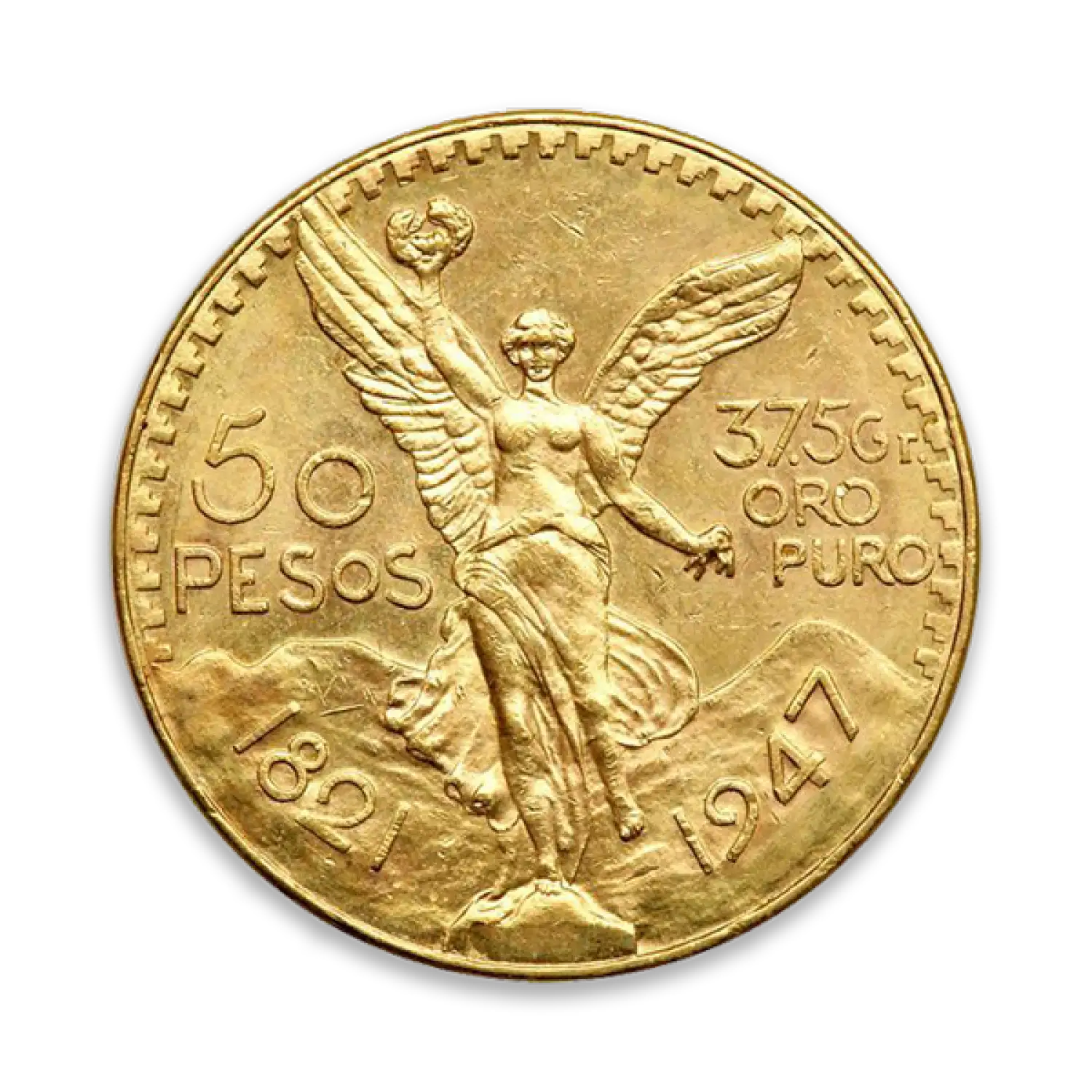 Each Mexico 50 Peso Gold Coin contains 37.501 grams of gold. The obverse of the Mexican 50 Pesos Gold Coin features the image of Winged Victory, with a laurel wreath in her right hand and broken chains in her left.