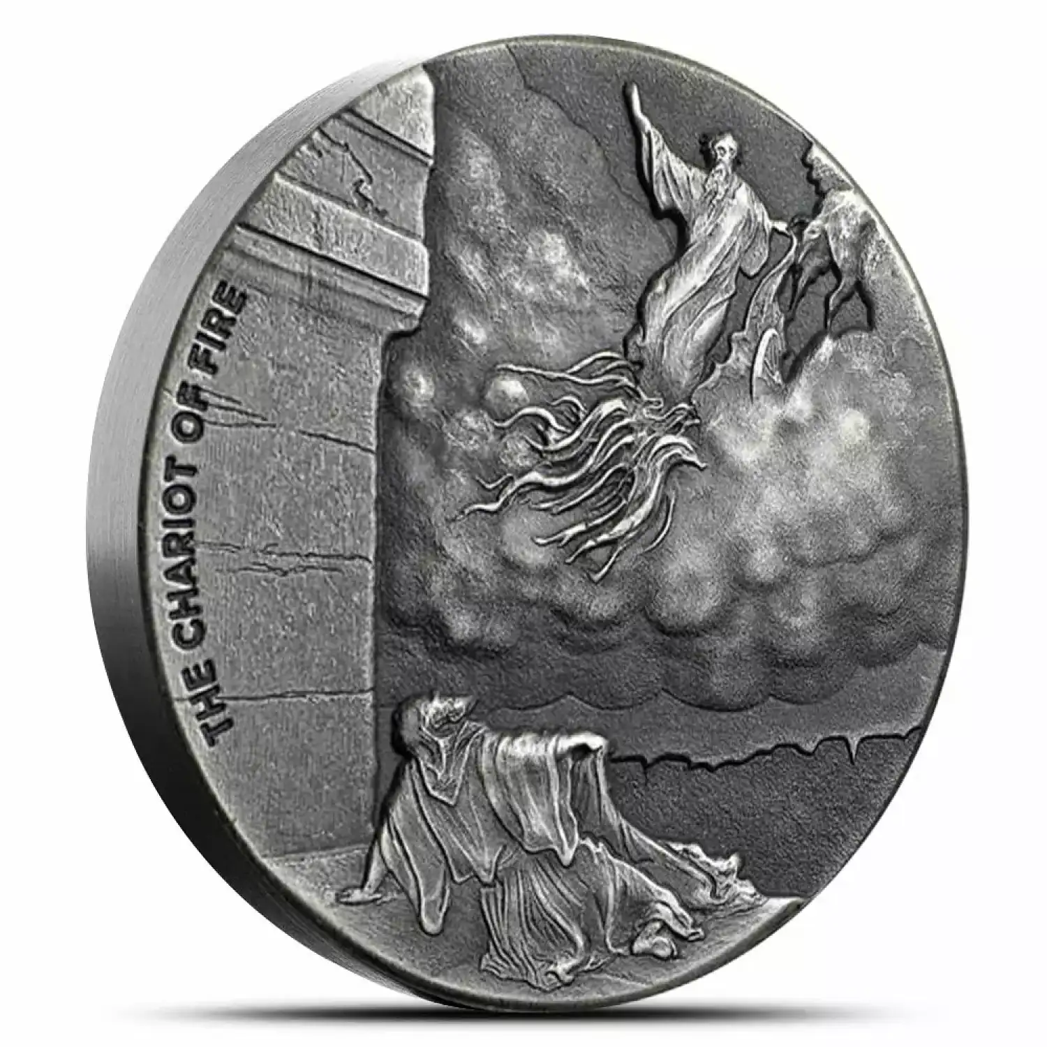 Elijah is a unique figure in the Hebrew and Christian Bibles. Some early scholars thought that Jesus, in the Christian Bible, was in fact Elijah. For the Hebrews, he was more of a prophet. The specific story depicted on these coins recounts the moment Elijah is taken to heaven in a flaming chariot drawn by flaming horses in front of his follower and disciple Elisha.