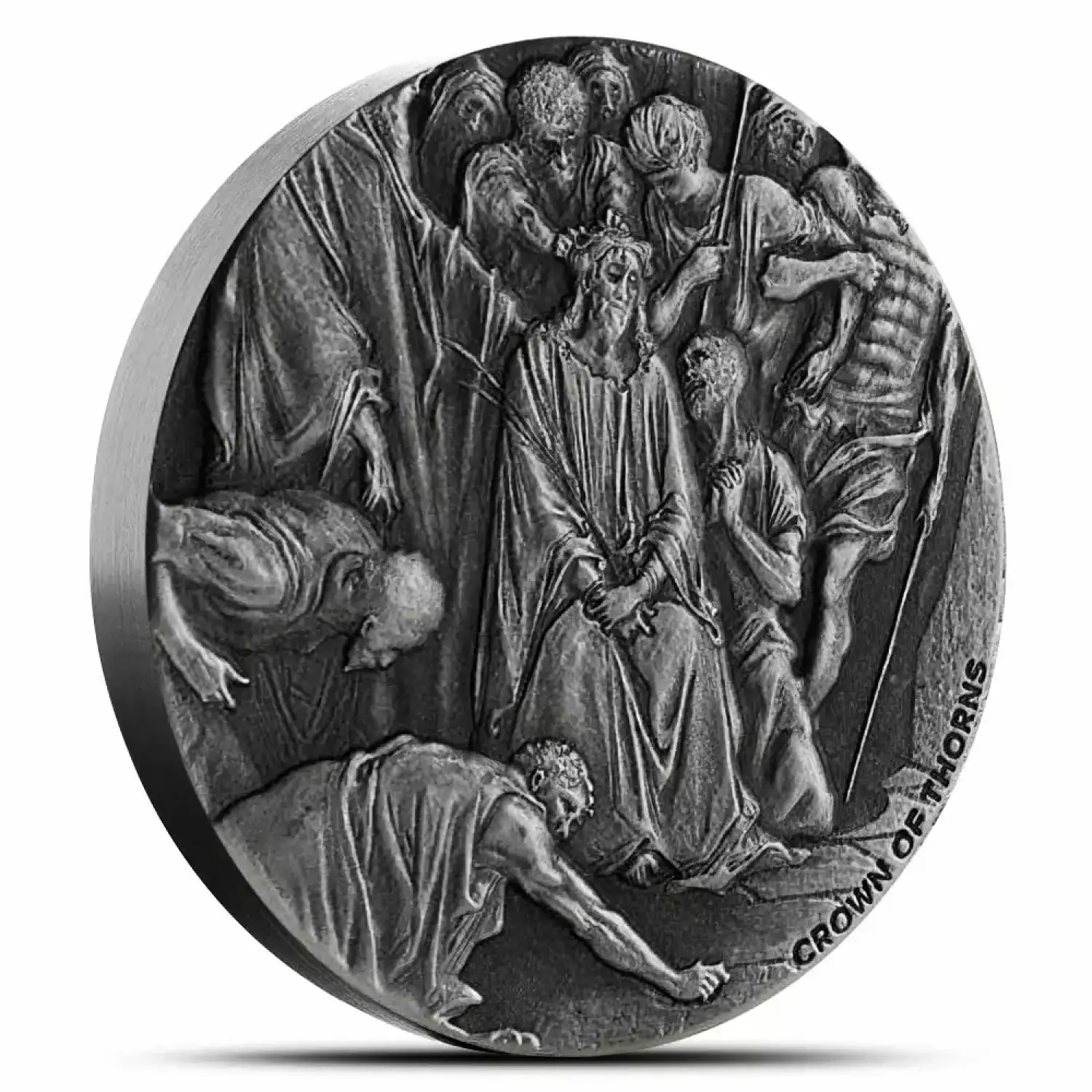 On the reverse of 2019 2 oz Crown of Thorns Biblical Silver Coins, you can see Jesus seated in the center of the design as several soldiers mockingly “crown” him as the new King of the Jews. It is said the soldiers shouted “Hail, King of the Jews” to him and knelt down in mock worship before spitting on him.