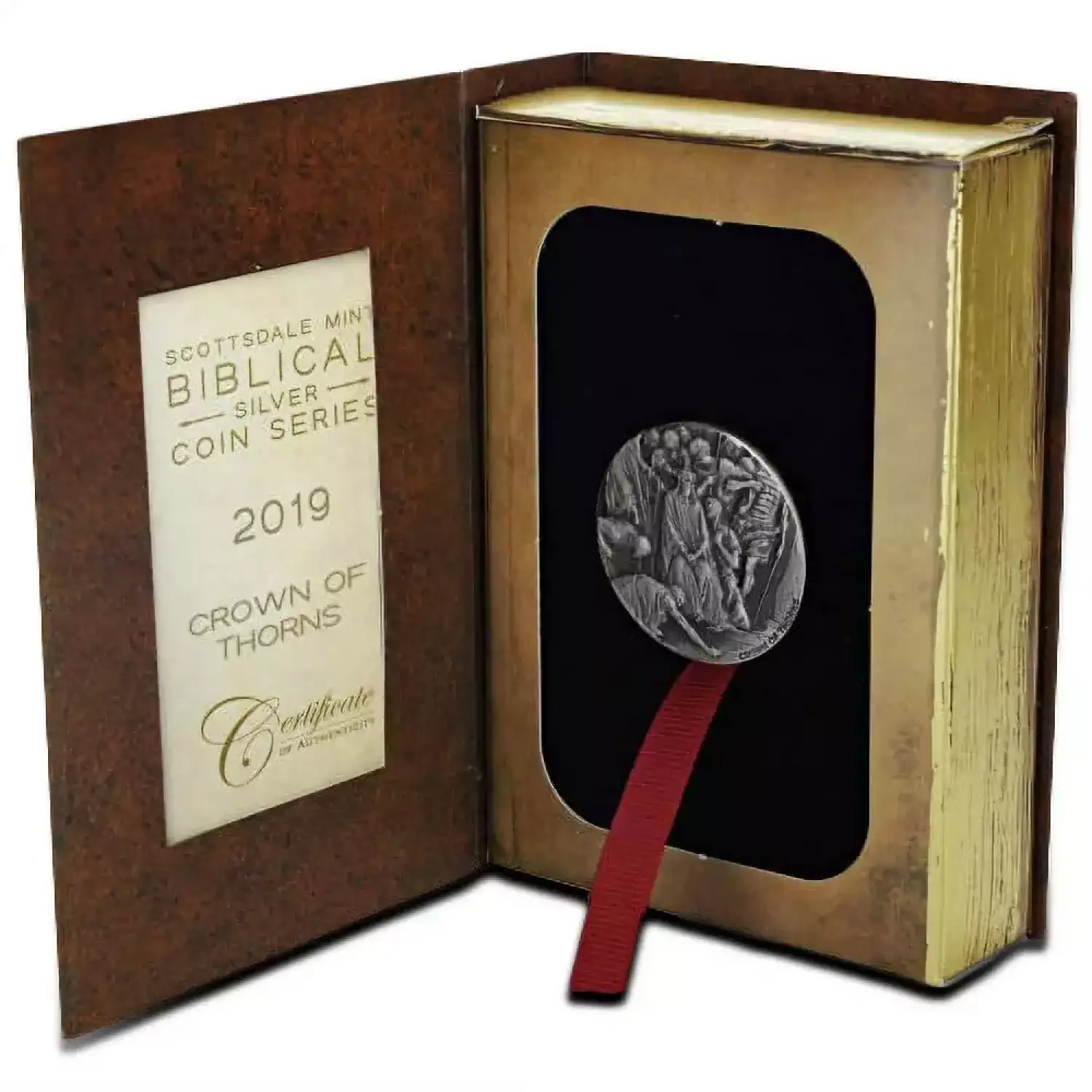 Each 2019 2 oz Crown of Thorns Biblical Silver Coin in this listing comes with a beautiful presentation packaging meant to reflect the appearance of the Bible. Each coin in the series comes with an individually numbered Certificate of Authenticity and has its unique serial number laser-etched on the edge of the product. The coins in this collection also feature the verse from the Bible that inspired the design on the reverse.