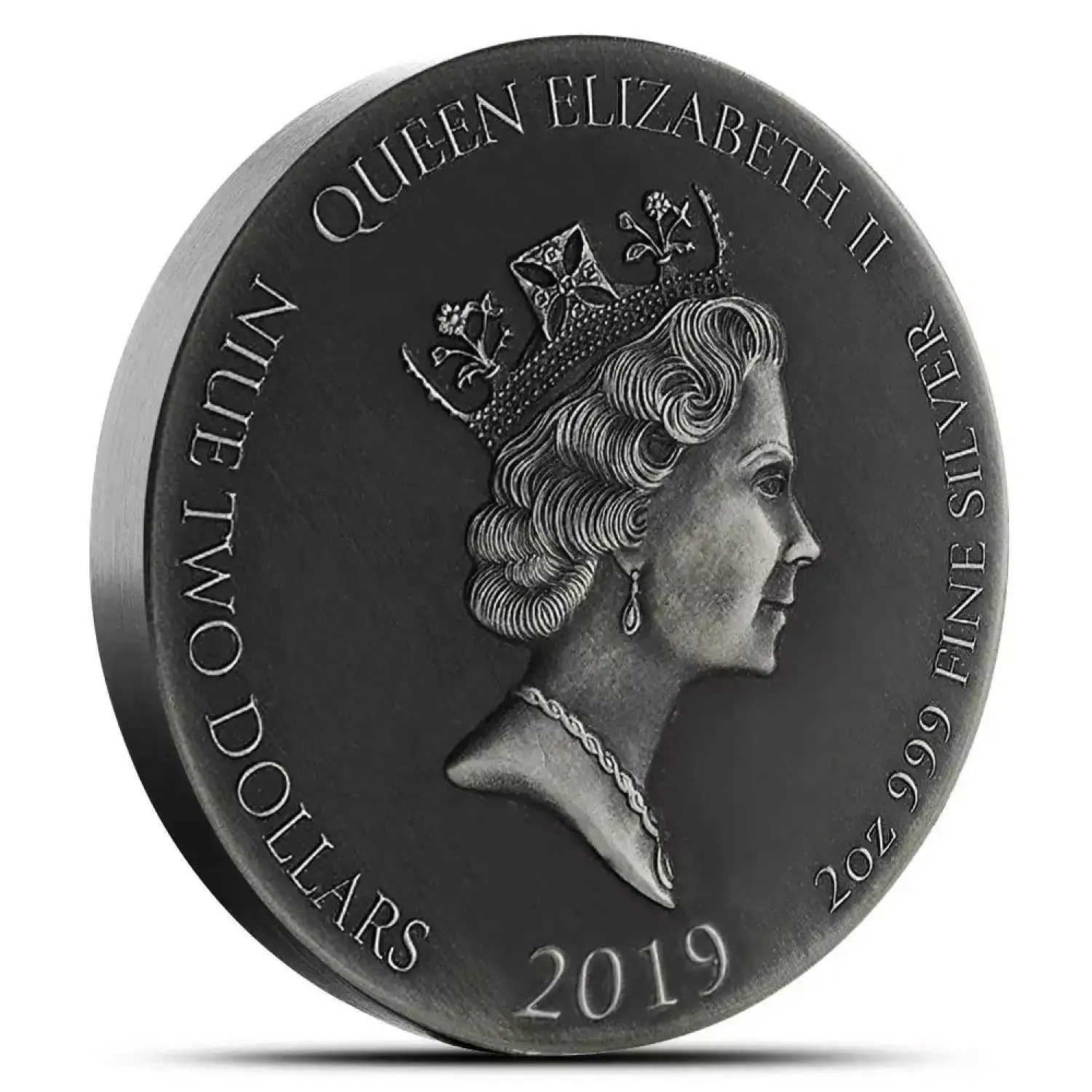 On the obverse of 2019 2 oz First Born Slain Biblical Silver Coins is a depiction of Queen Elizabeth II. The Scottsdale Mint chose Raphael Maklouf’s 1985 depiction of Her Majesty wearing the Royal Diadem crown. This was the first Royal Mint of England effigy of the Queen to feature her with earrings and a necklace as well.