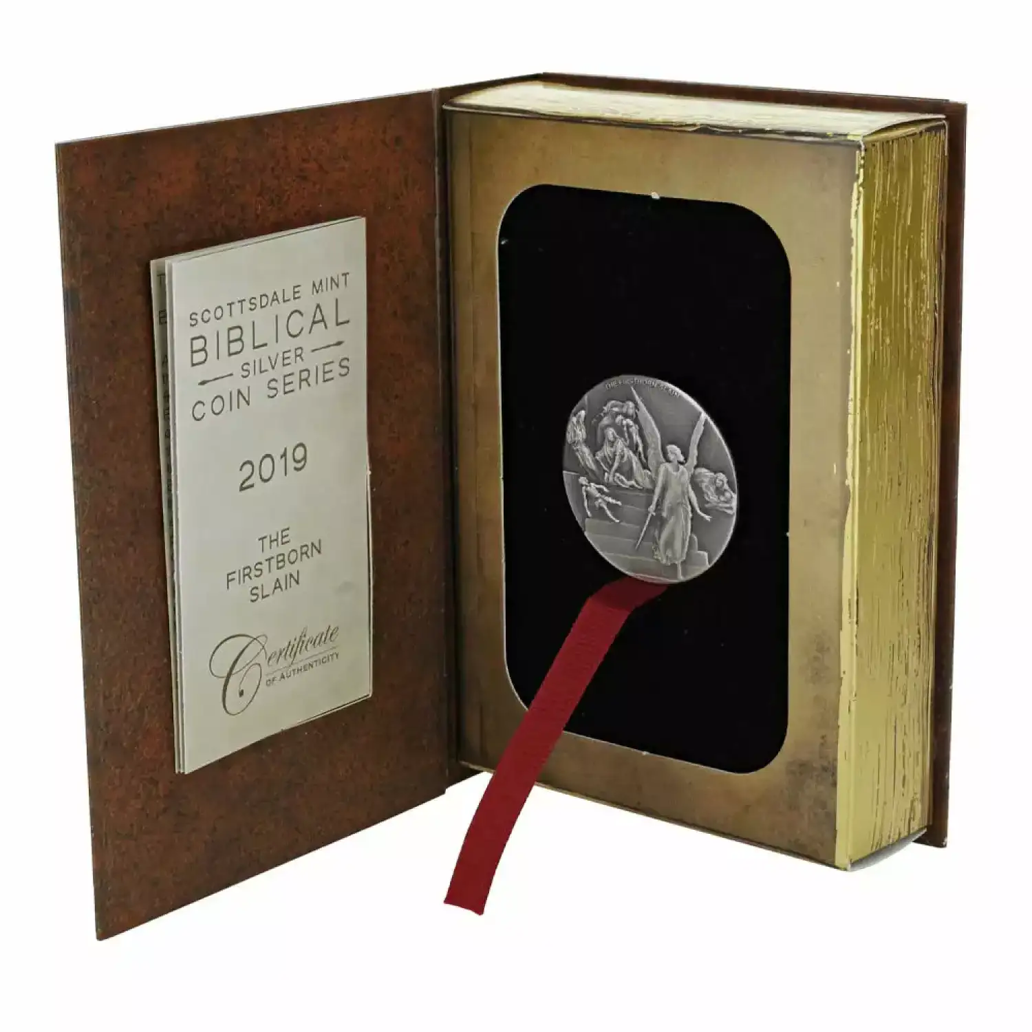 These 2019 2 oz First Born Slain Biblical Silver Coins are available to you inside of presentation boxes that capture the look of the Bible. Each one comes with an individually numbered Certificate of Authenticity that matches the serial number laser-etched on to the edge of the coins.