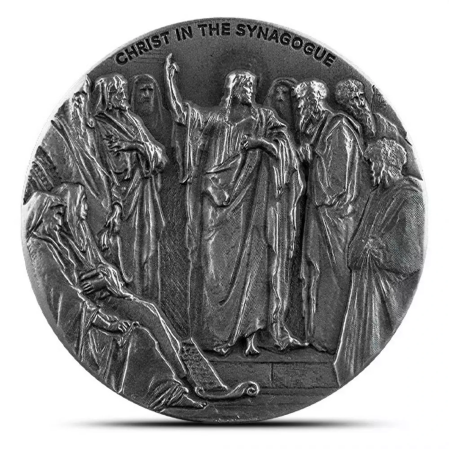 The reverse side of 2020 2 oz Christ in the Synagogue Biblical Silver Coins features a depiction of Jesus surrounded by onlookers as he preaches in the synagogue. The moment featured here references the Gospel of Matthew’s account of Jesus teaching in his hometown synagogue in Nazareth, with onlookers confused by his wisdom and knowledge, while also offended by his ability to perform miracles.
