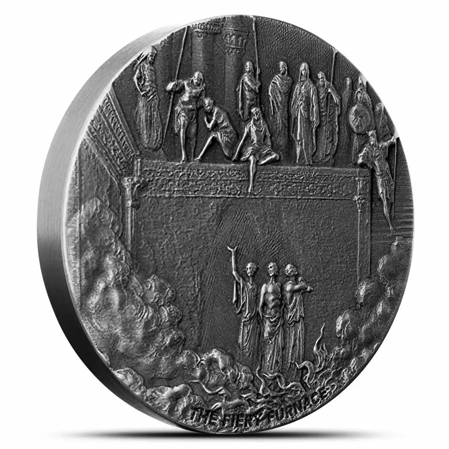 The reverse face of 2020 2 oz Fiery Furnace Biblical Silver Coins comes with a depiction of three Hebrew men down below in a furnace. As the flames whip up and smoke fills the chamber, Babylonians look on from above. The men were condemned by King Nebuchadnezzar II, King of Babylon, for failing to worship his image. Leaving their faith in their one, true God, the men were spared death by the flames.