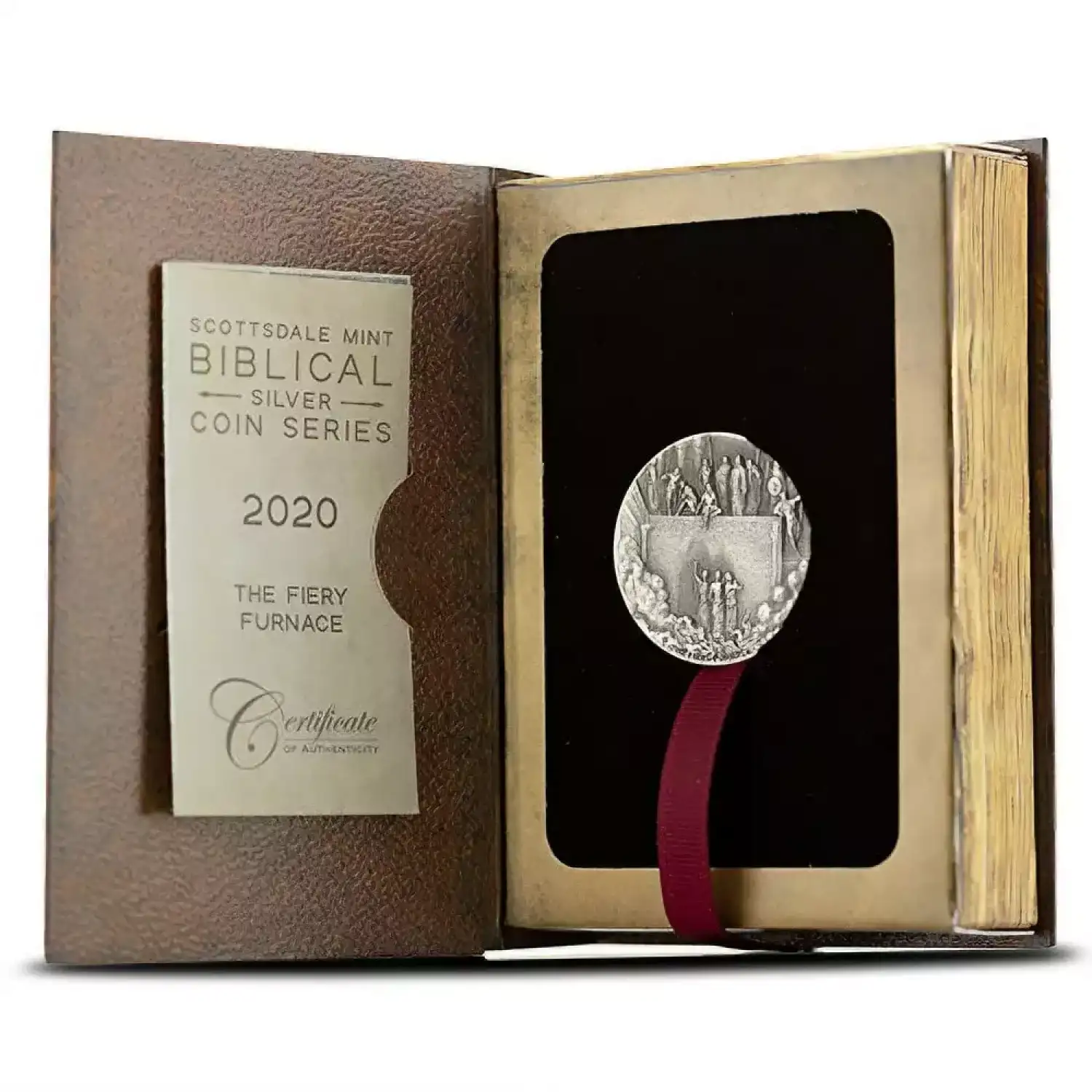 All of the 2020 2 oz Fiery Furnace Biblical Silver Coins in this product listing ship to you with beautiful presentation packaging. The coins in this series are all individually packaged inside of Bible-inspired booklets. The coins come with a Certificate of Authenticity that states the Bible passage that inspired the design on the reverse.