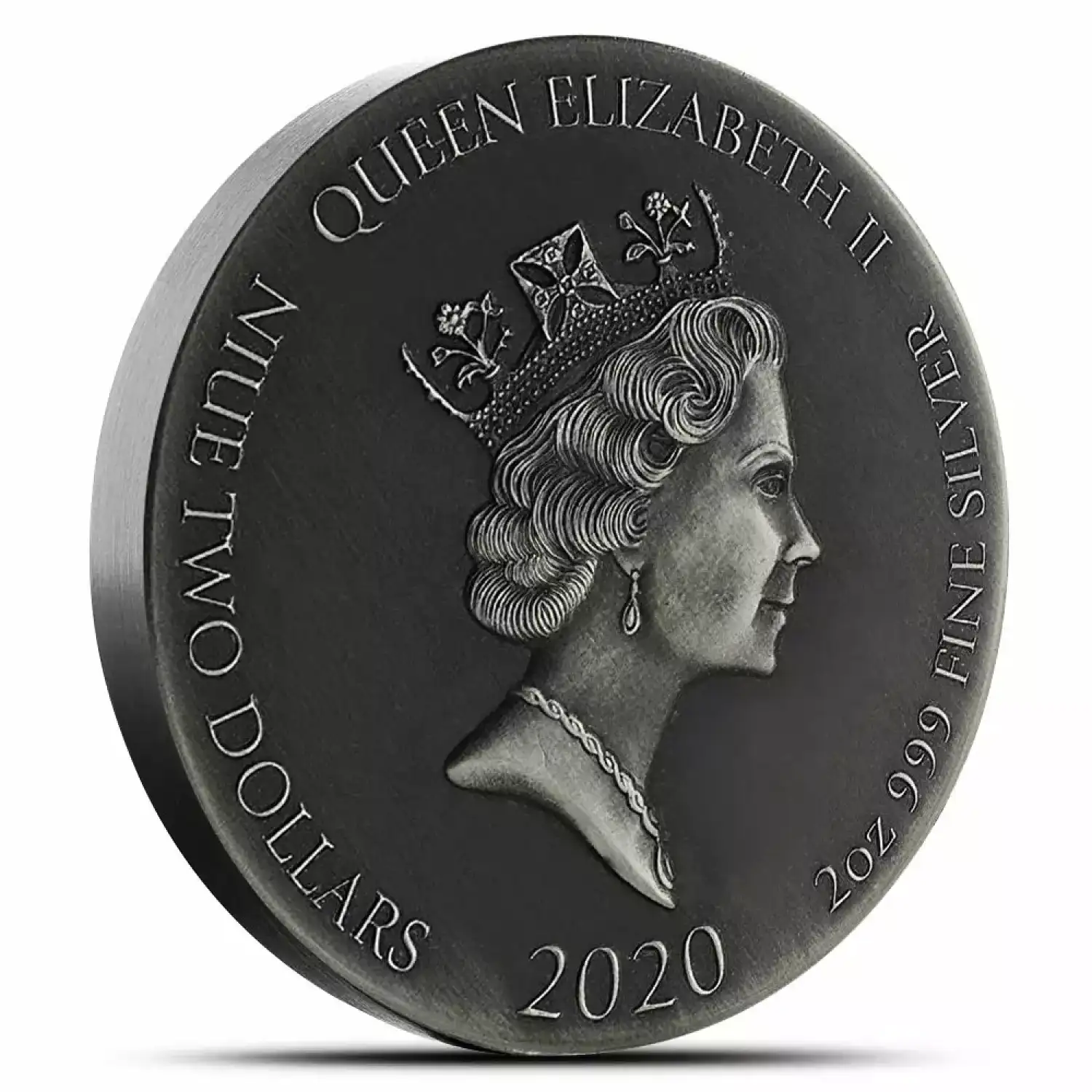 On the obverse of 2020 Fiery Furnace Biblical Silver Coins, you will find a right-profile effigy of Queen Elizabeth II. The Scottsdale Mint has gone with the ornate, elegant depiction of Her Majesty created in 1985 by Raphael Maklouf. The design shows the Queen with a necklace resting on her shoulders and around her neck, earrings, and the George IV State Diadem Crown.