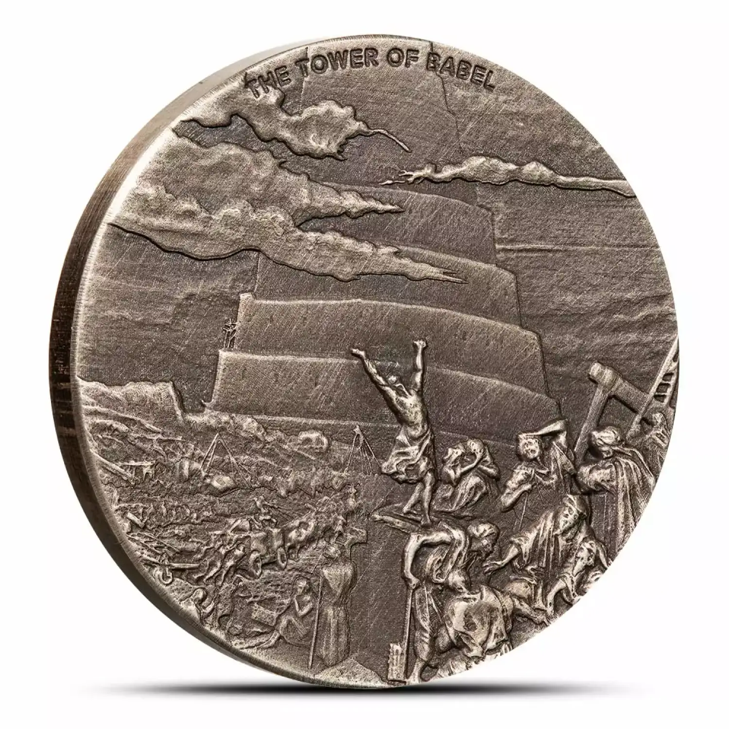 Each of the 2023 2 oz The Tower of Babel Biblical Silver Coins available here comes packaged in an individual display box with a Bible design theme. There is a Certificate of Authenticity inside that showcases the applicable verses from the Bible in the Book of Genesis. Each coin features a rimless blank with an antique finish to complete the look of ancient coinage.