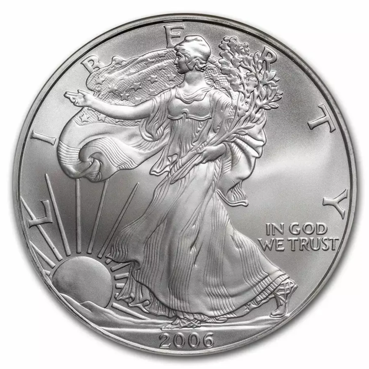 The 2006 One dollar is part of a series of Silver eagle coins struck from 1986-Present. The specific variety is Silver Eagle. Struck in Philadelphia and designated as a Business (MS) strike, this coin is made of 99.93% silver, 0.007% copper from a mintage of 10,676,522 struck.