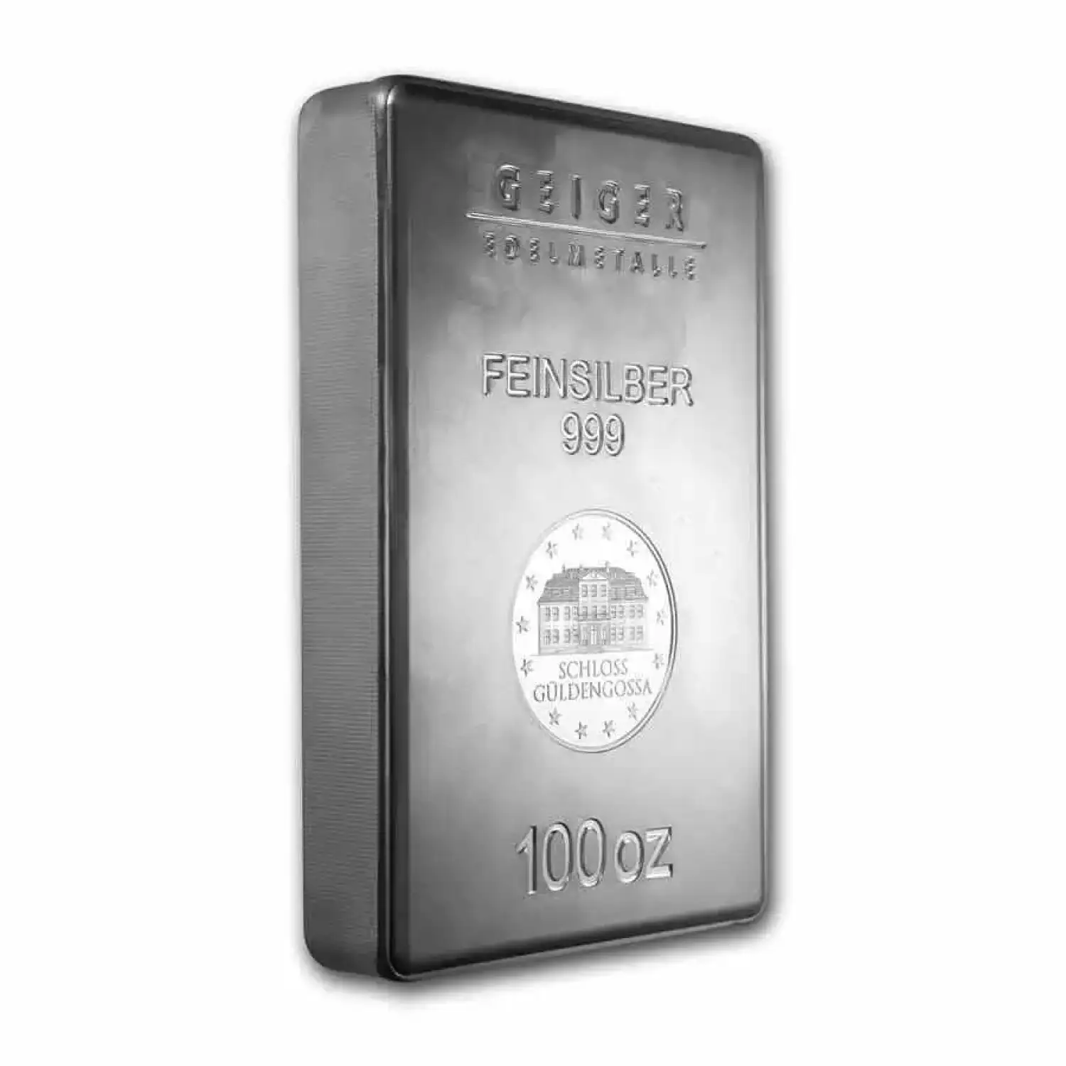 This 100 oz Geiger Silver Bar, like all bars in Geiger Edelmetalle’s security line, showcases several distinct security features. Each bar contains reed edges with a security label that states a unique serial number. This number can be verified with Geiger Edelmetalle which helps add an extra layer of security. Each bar is stamped with the mint’s name “Geiger Edelemetalle” as well as the word “Feinsilber” which is German for “Fine Silver.” Every Geiger bar is also stamped with the image of the baroque castle “Schloss Güldengossa” and the purity and weight of the bar.