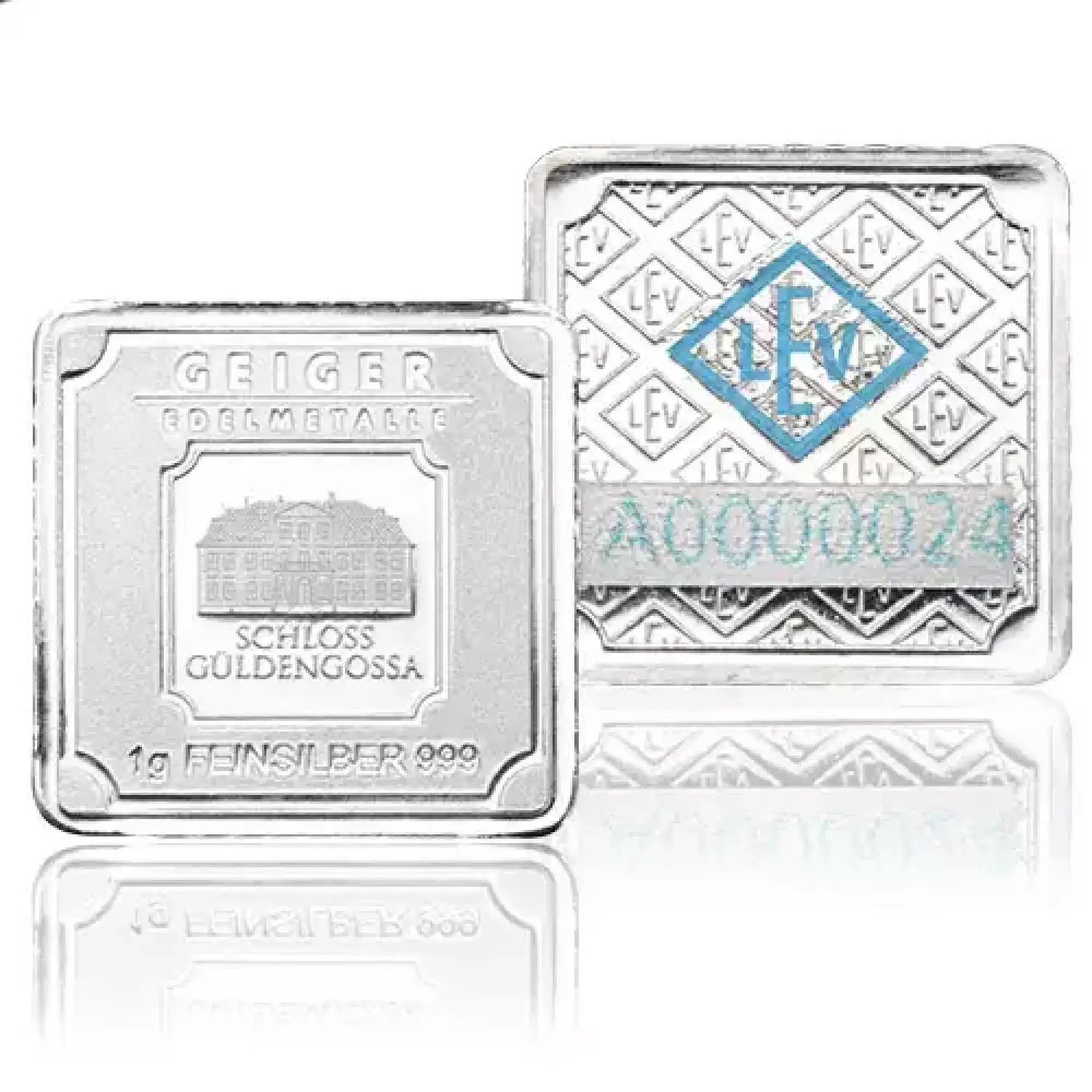 On the obverse of the 1 Gram Geiger Square Silver Bar is the image of Schloss Guldengossa. The headquarters of the refinery today, the castle was built near Leipzig, Germany in 1720 and was the first registered office of the company. Engravings on this side include the name of the refinery and the bar’s weight, metal content, and purity.