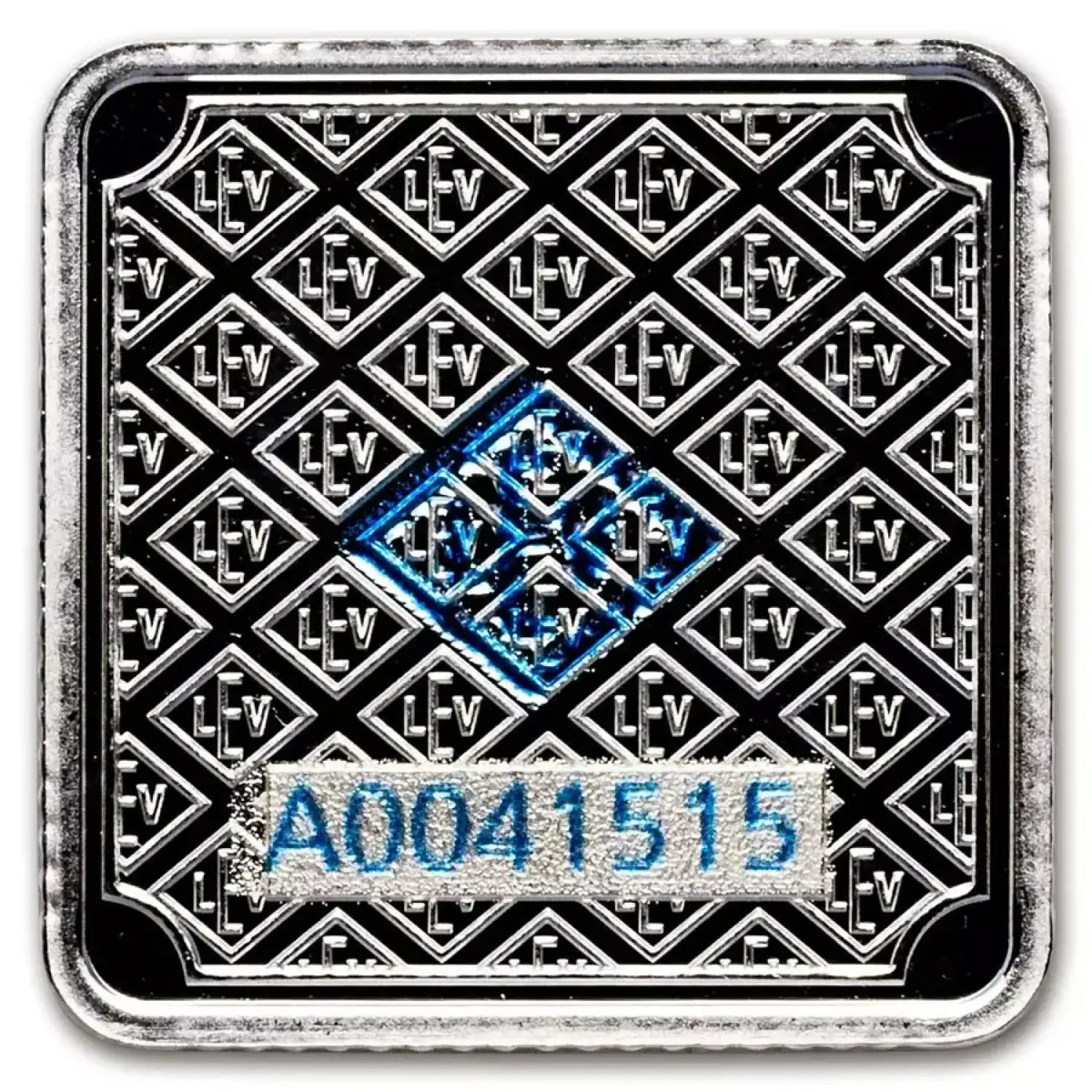 The reverse of the 5 Gram Geiger Square Silver Bar features the repeating rhombus logo of Geiger Edelmetalle. This LEV rhombus repeats across the bar in the same pattern, with a serial number bar along the bottom and the “LEV” rhombus visible in the center when a black light hits the bar.