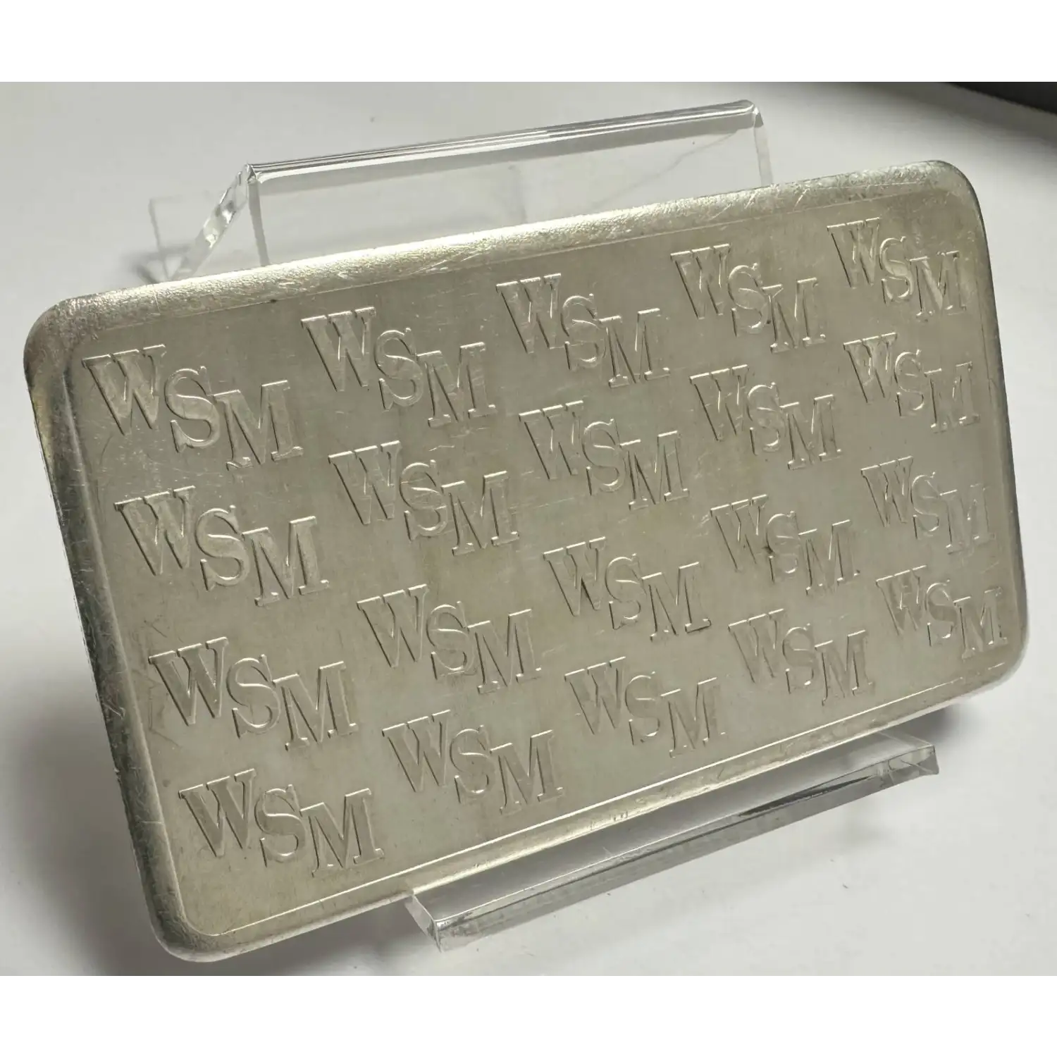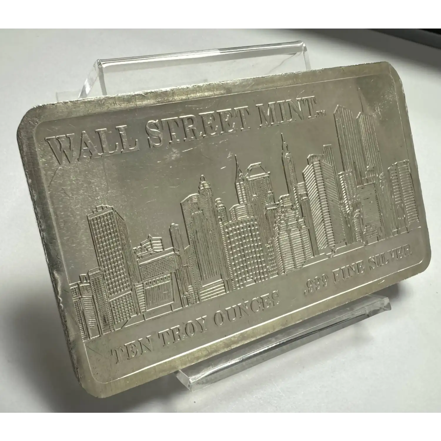 Inscriptions on the obverse of the bar include “Wall Street Mint” above the skyline and “Ten Troy Ounces .999 Fine Silver” below it. The reverse face of the bars includes a repeating design of the mint initials “WSM.”
