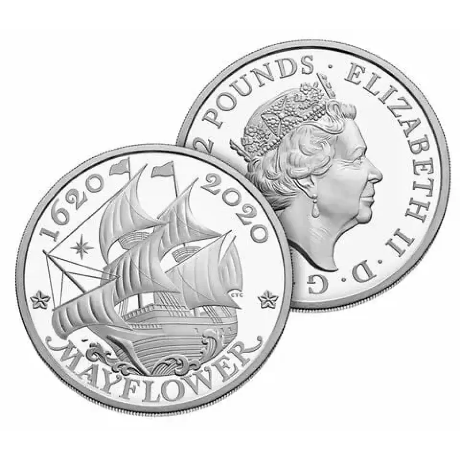 The Royal Mint silver coin reverse depicts the Mayflower almost bursting out of the frame as it sails through the rough seas. This dramatic interpretation of the ship on its journey to the New World represents the unwavering determination of the passengers and crew. The design features the inscriptions “1620,” “2020,” and “MAYFLOWER” in commemoration of the 400th anniversary.
