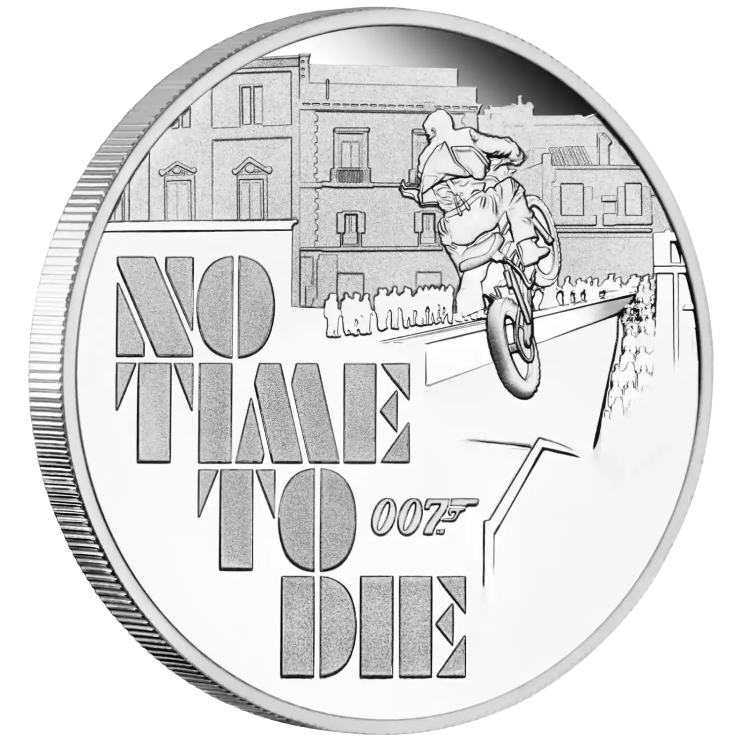 The coin depicts an action-packed motor-cycle scene from No Time To Die in a design incorporating the film's title logo and the iconic Bond 007 gun logo. The reverse also includes The Perth Mint's 'P' mintmark.