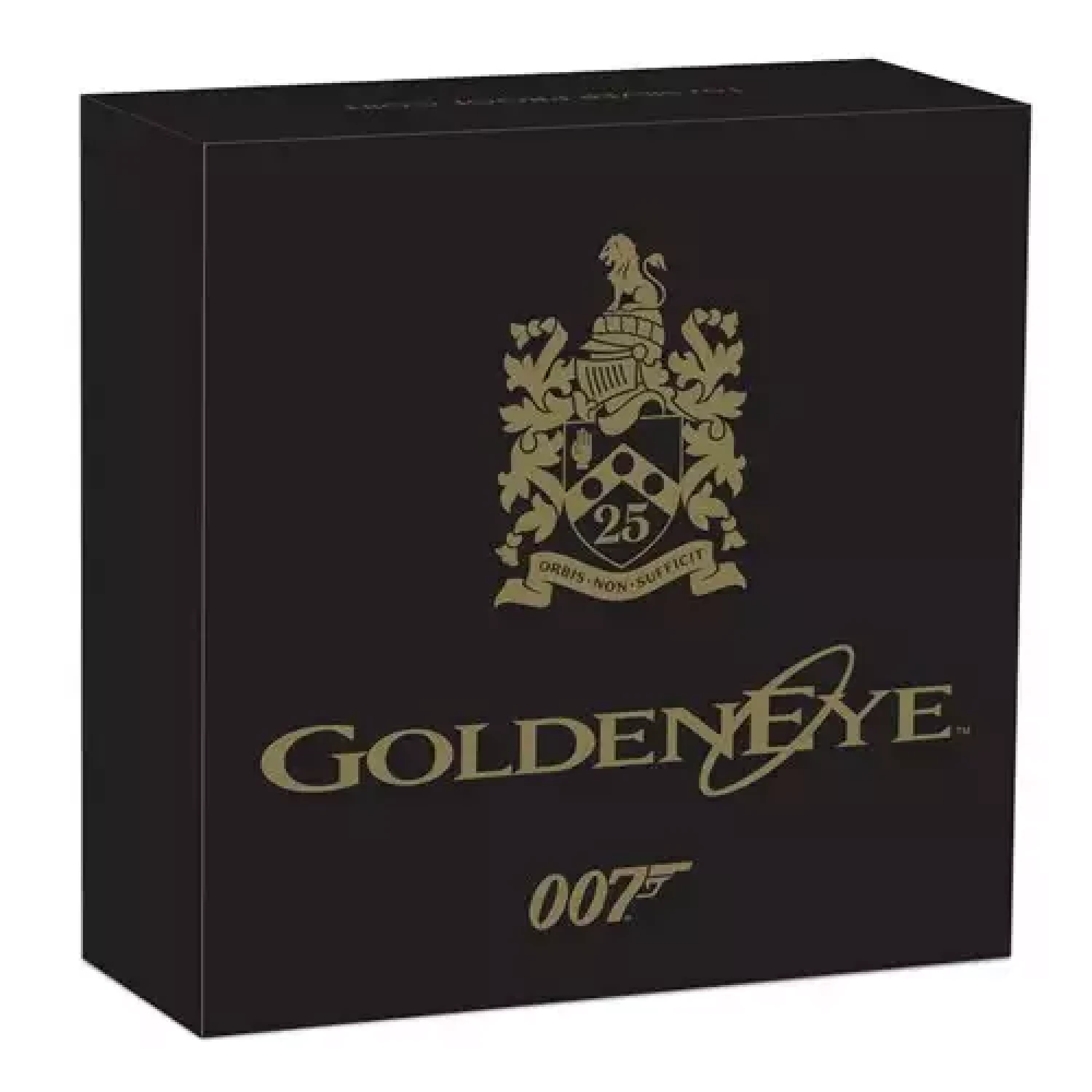 The coin portrays James Bond in a swallow dive with a bungee cord attached to his ankles against representations of a dam wall and mountains. The reverse includes the official GoldenEye logo in colour and the Bond family coat of arms bearing the motto ORBIS NON SUFFICIT (the world is not enough) and the number 25.