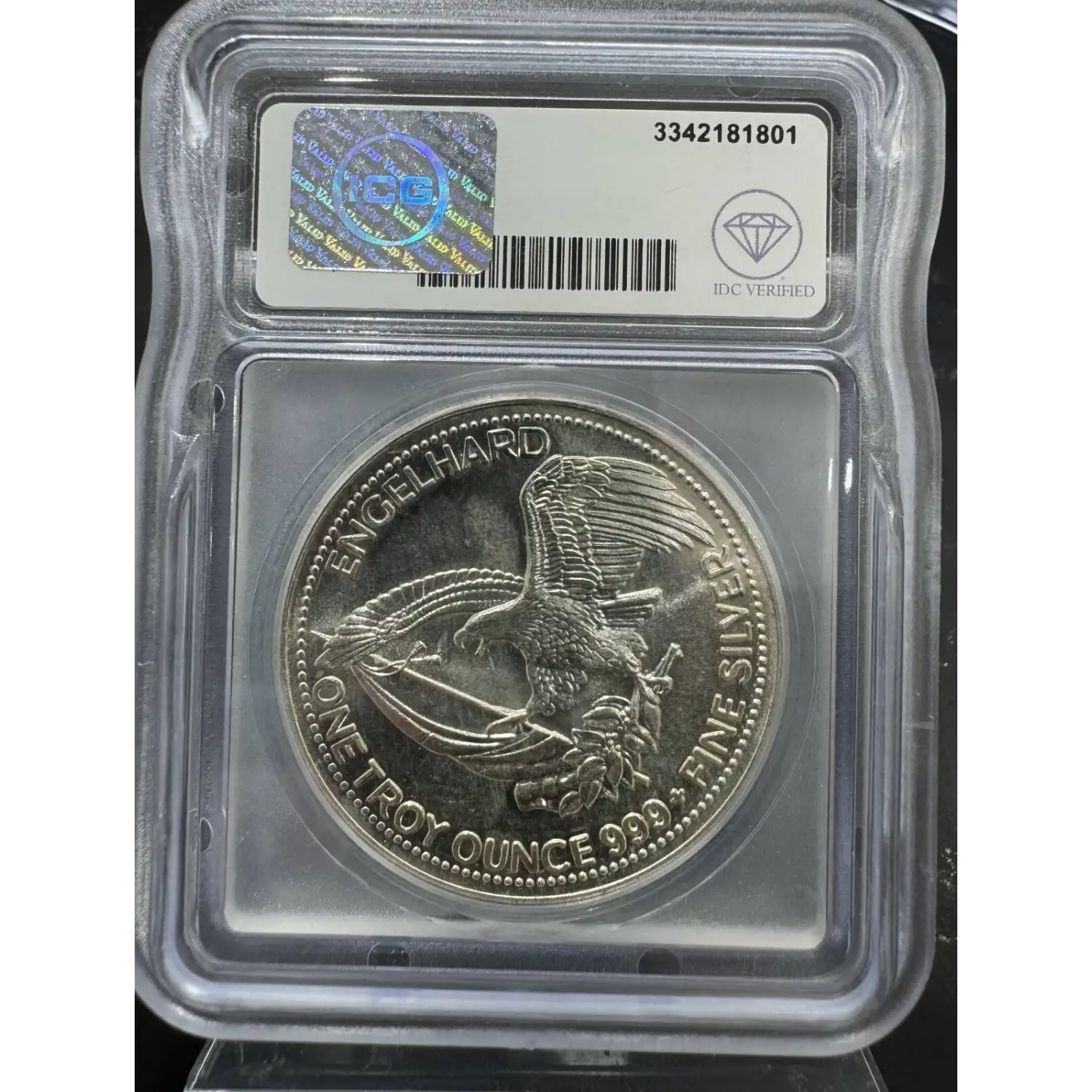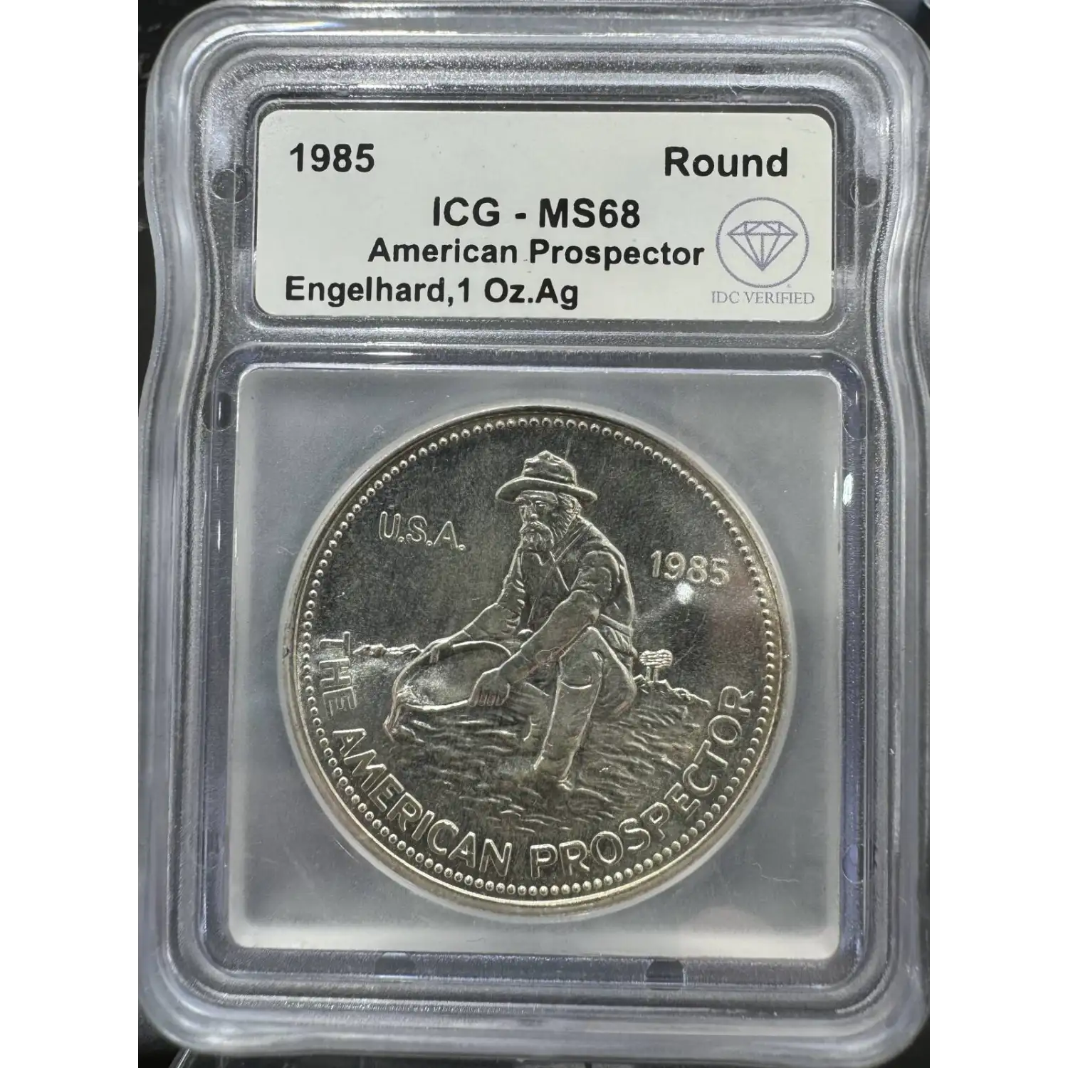 | Name | 1985 IDC Verified 1 oz Silver Engelhard Prospector Round ICG MS68 - Fine Font Variety |