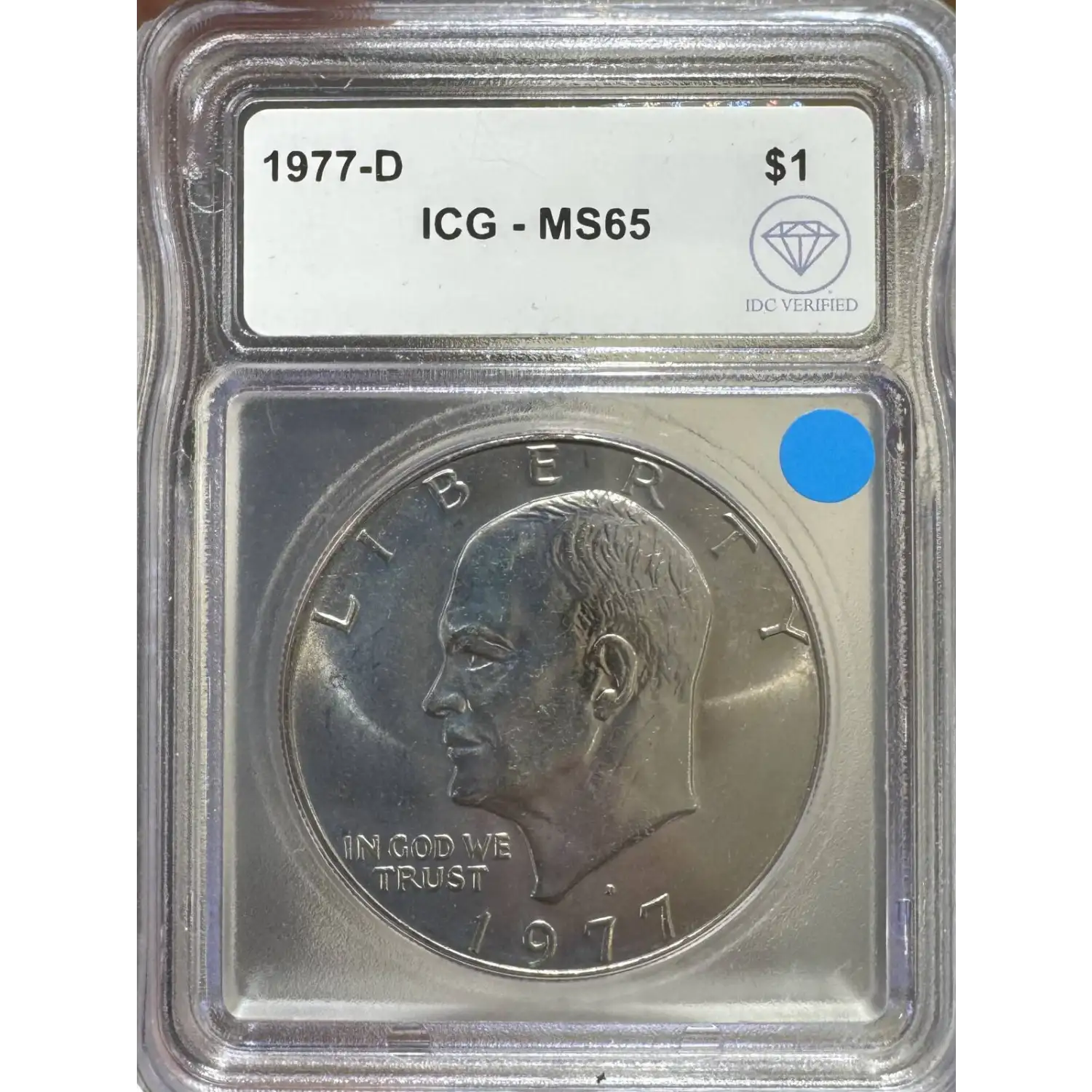 The 1977-D One Dollar is part of a series of Eisenhower dollar coins struck from 1971-1978. Struck in Denver and designated as a Business (MS) strike, this coin is made of 75% copper; 25% nickel from a mintage of 32,983,006 struck.