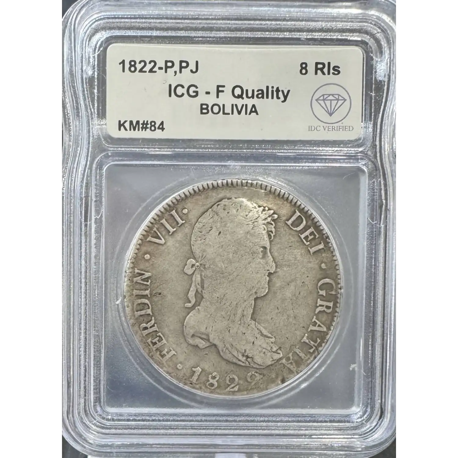 1822 P,PJ Bolivia Silver 8 REALES ICG F Quality IDC Verified KM#84