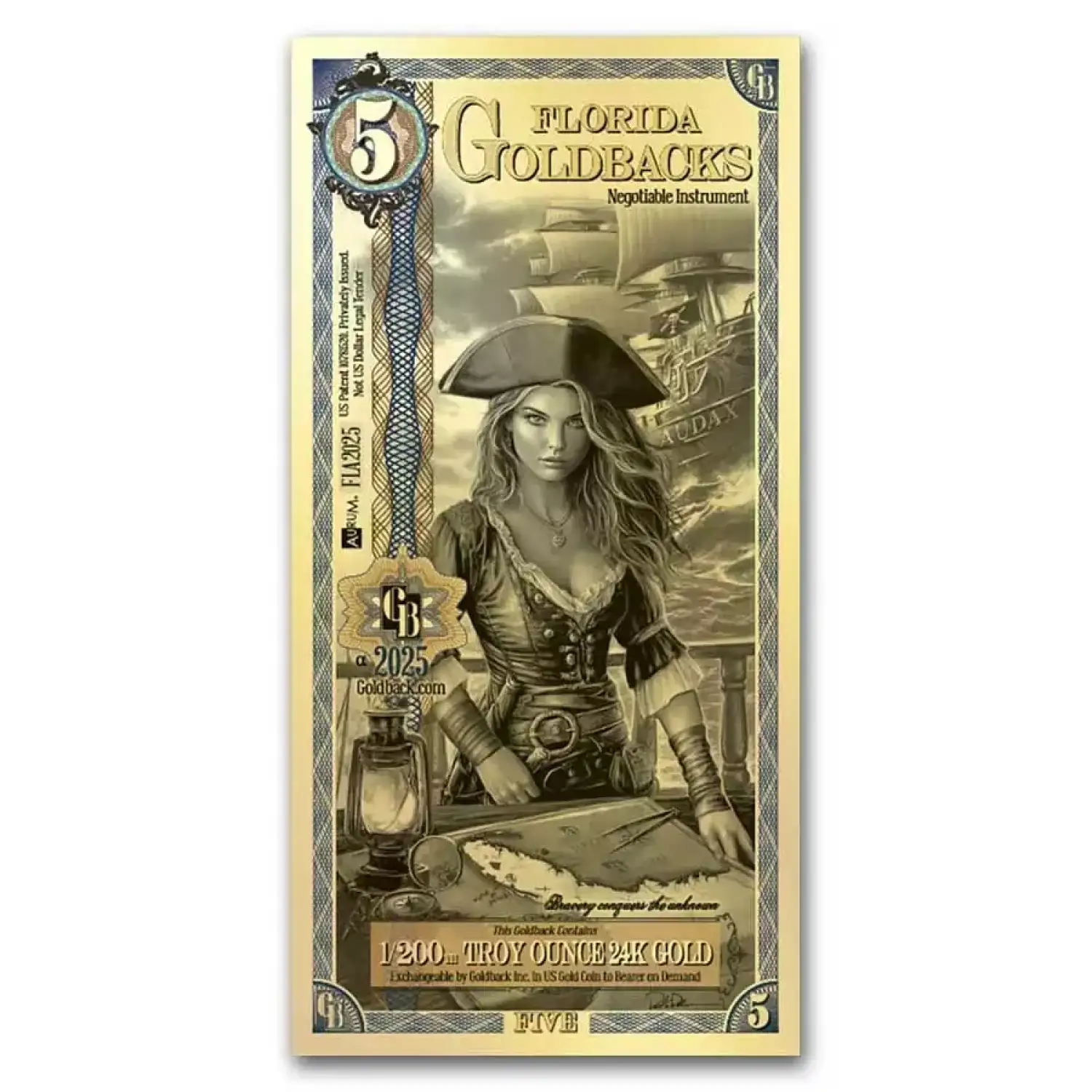 The Florida Five Goldback embodies the virtue “Audax” (Daring), represented by a privateer inspired by legendary figures Anne Bonny and Charlotte de Berry, who defied societal norms with their boldness during the Age of Sail. Florida’s coastline, a haven for pirates and privateers in the 17th and 18th centuries, played a pivotal role in maritime history, with tales of hidden treasures and legendary figures like Blackbeard shaping its adventurous past. The artwork captures this spirit with stormy seas and fierce winds, symbolizing Florida’s resilience in the face of hurricanes, while tools like a compass, lantern, and piece of eight highlight the courage, strategy, and faith required to navigate uncertain waters. From the pirate flag to the turbulent waves, the design celebrates the daring spirit of those who braved Florida’s storied maritime history.