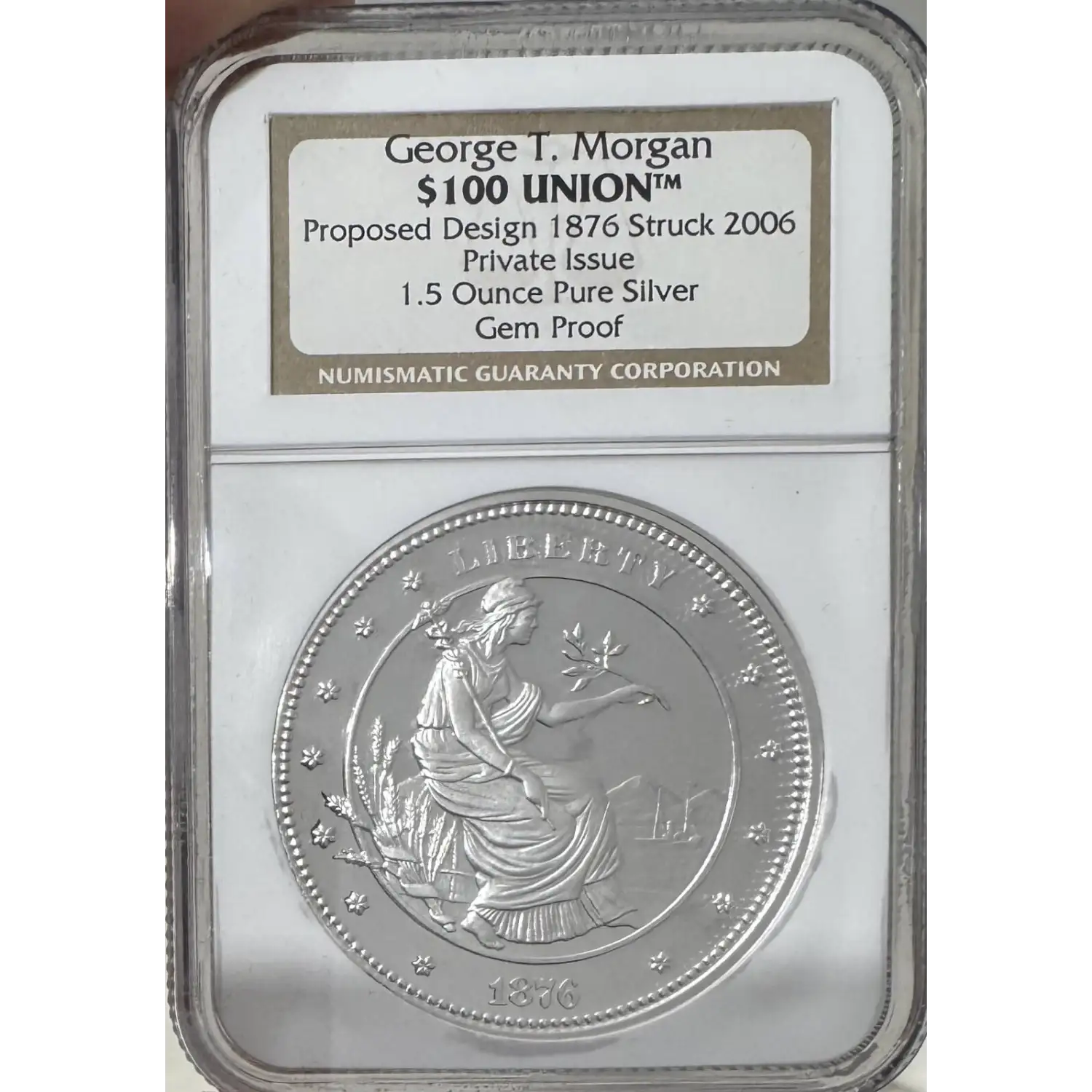 | Name | 1876 Struck 2006 George T Morgan $100 Union Proposed Design 1.5 OZ Silver NGC |