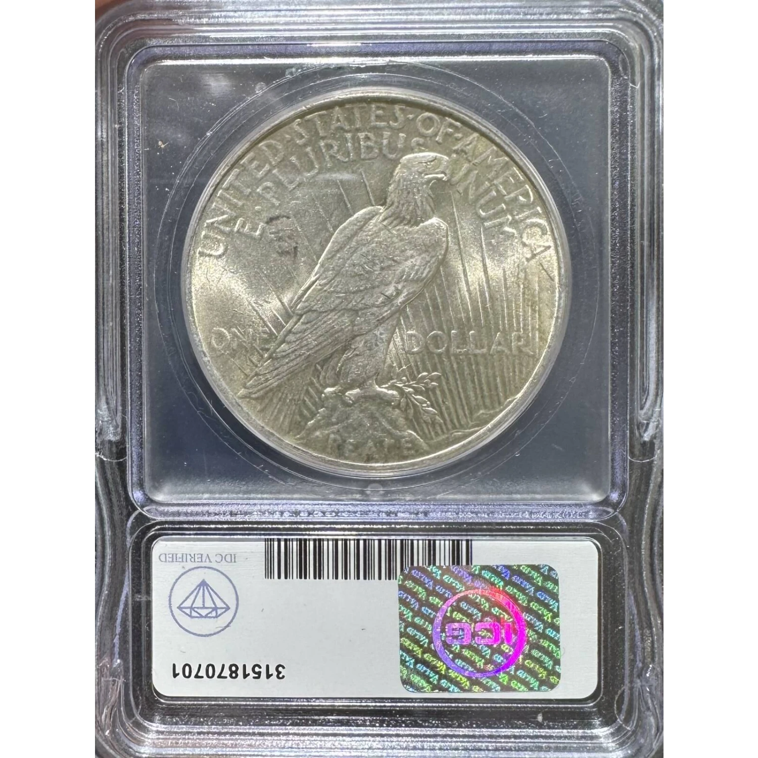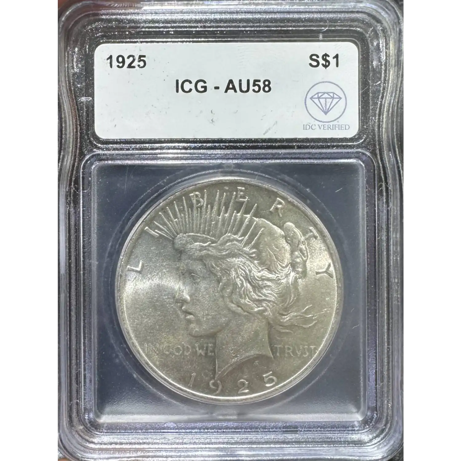 | Name | 1925 Peace Silver Dollar ICG AU58 IDC Verified |