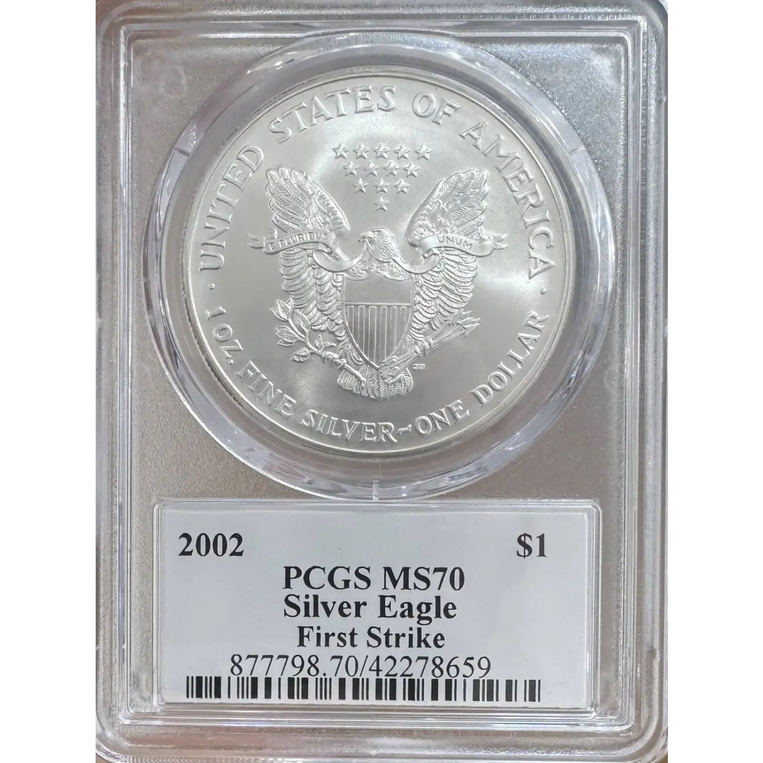 The 2002 One dollar is part of a series of Silver eagle coins struck from 1986-Present. The specific variety is Silver Eagle. Struck in Philadelphia and designated as a Business (MS) strike, this coin is made of 99.93% silver, 0.007% copper from a mintage of 10,539,026 struck.