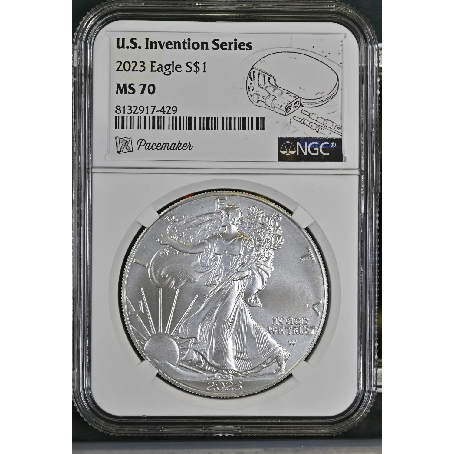 This 2023 American Silver Eagle US Invention Series NGC MS70 Pacemakers Label coin is a must-have for any coin collector. The coin is made of 0.999 silver and has a strike type of business. It features the iconic American Eagle design and is certified by NGC.