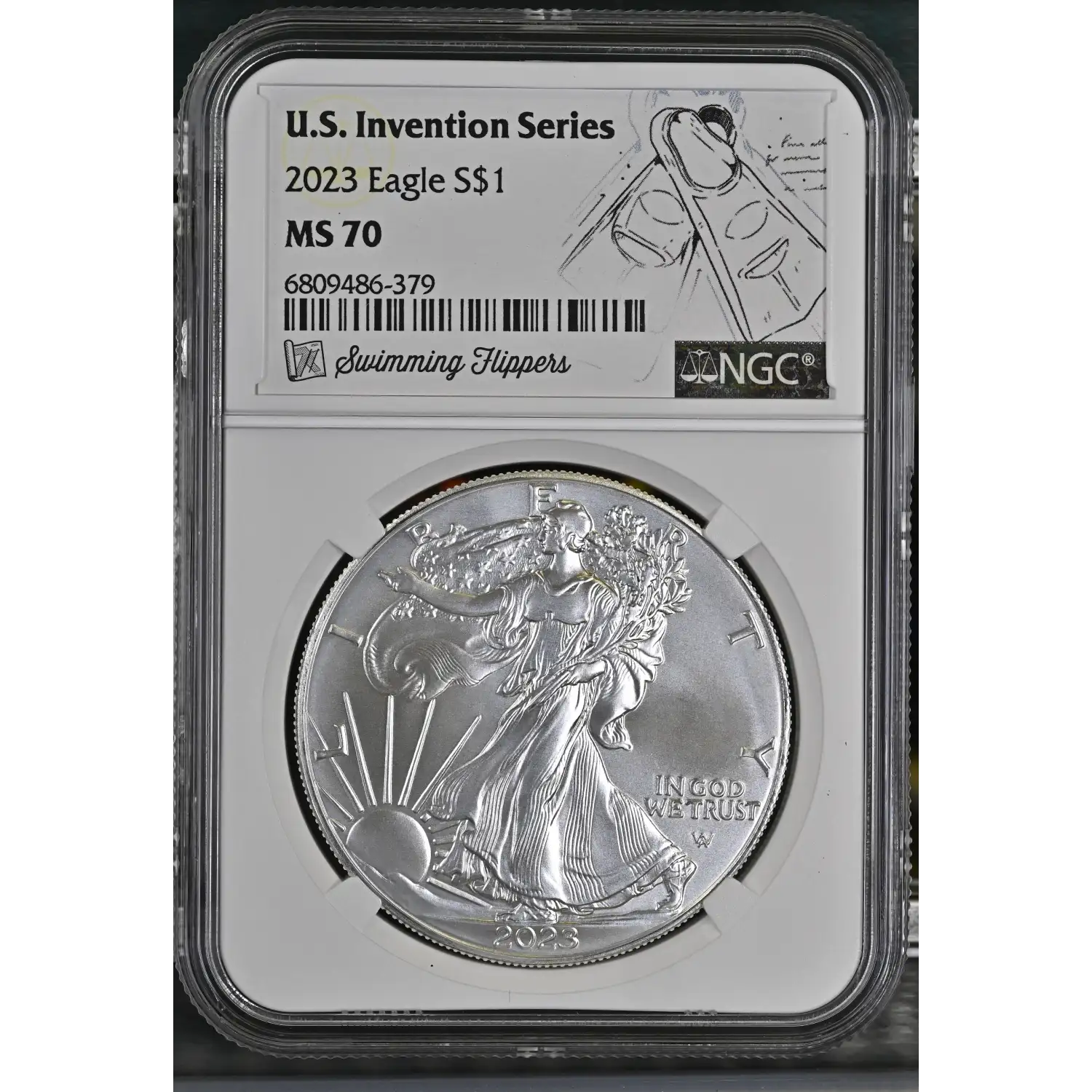 This 2023 American Silver Eagle US Invention Series NGC MS70 Swimming Flippers Label coin is a must-have for any coin collector. The coin is made of 0.999 silver and has a strike type of business. It features the iconic American Eagle design and is certified by NGC.