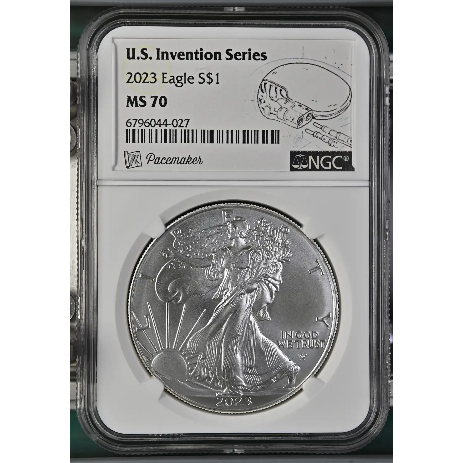 This 2023 American Silver Eagle US Invention Series NGC MS70 Pacemaker Label coin is a must-have for any coin collector. The coin is made of 0.999 silver and has a strike type of business. It features the iconic American Eagle design and is certified by NGC.