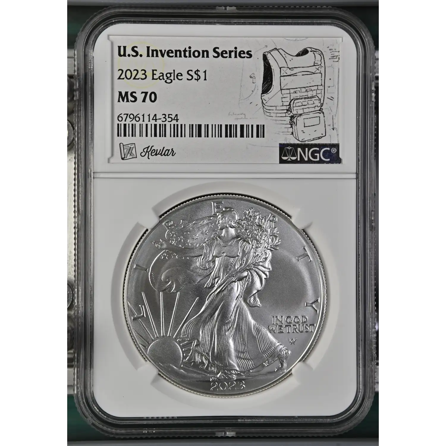 This 2023 American Silver Eagle US Invention Series NGC MS70 Kevlar Label coin is a must-have for any coin collector. The coin is made of 0.999 silver and has a strike type of business. It features the iconic American Eagle design and is certified by NGC.