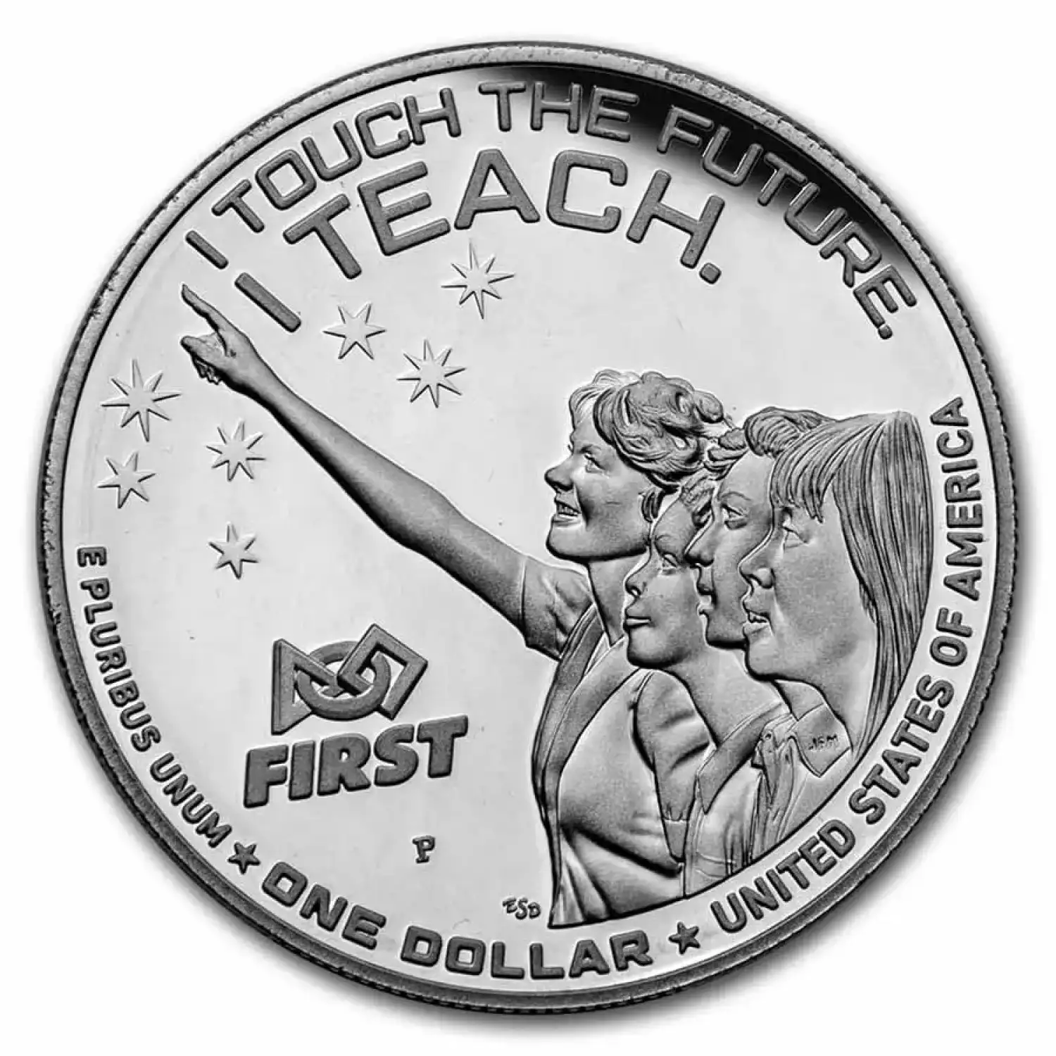 This $1 Silver commemorative honors the first participant in NASA's Teacher in Space Program, Christa McAuliffe.