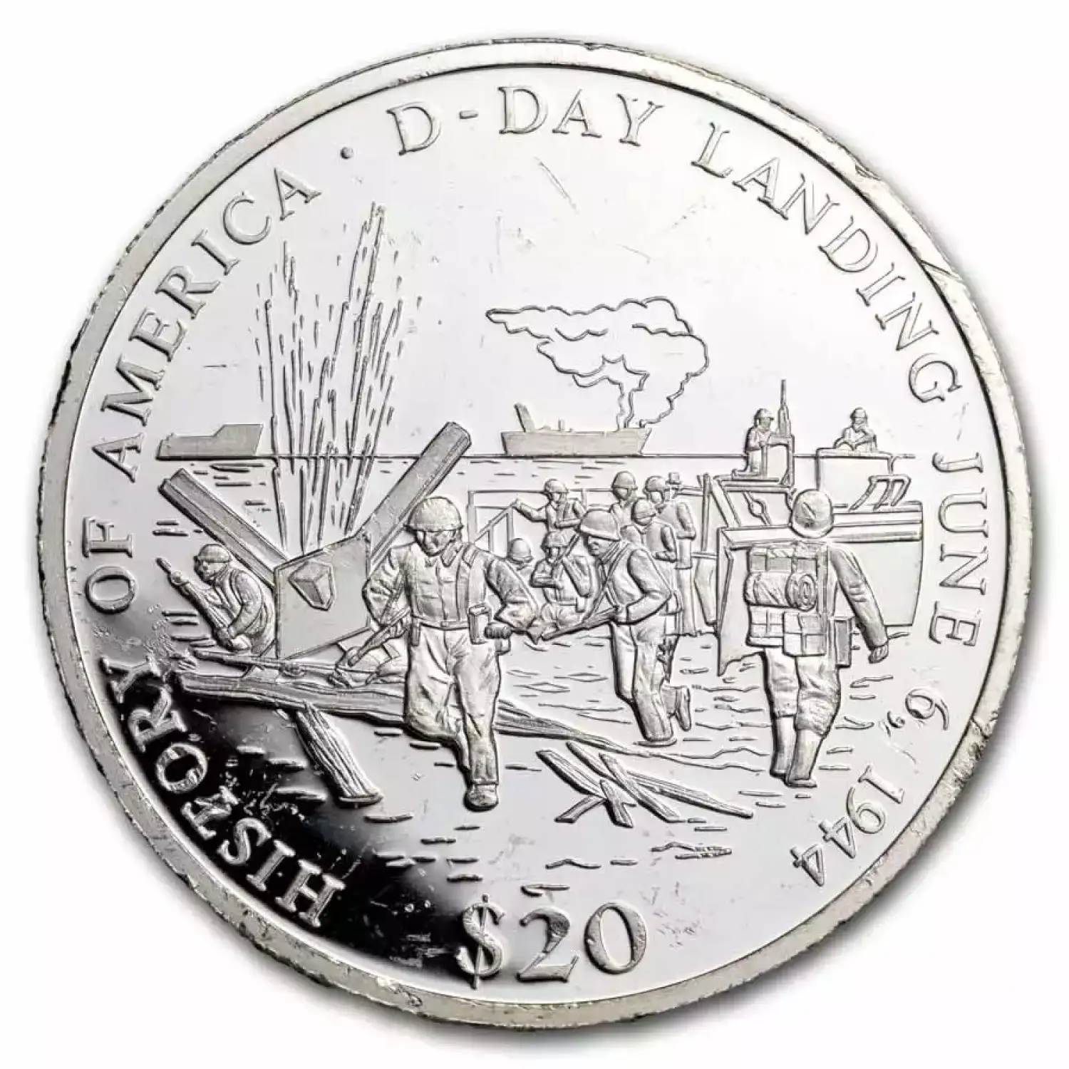 This History of America series silver proof contains .6424 oz. The D-Day Landing of June 6, 1944 is the subject of this coin. Soldiers walking ashore from amphibious landing vessels appear on this coin.