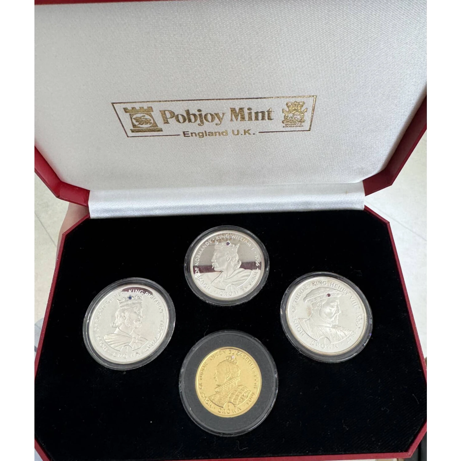 The "Crown Jewels" set was issued by Gibraltar to honor past rulers of England. Each coin has a small jewel embedded in the crown of the Sovereign. They are as follows; William: Amethyst, Richard: Sapphire, Henry: Ruby, Elizabeth: Diamond.