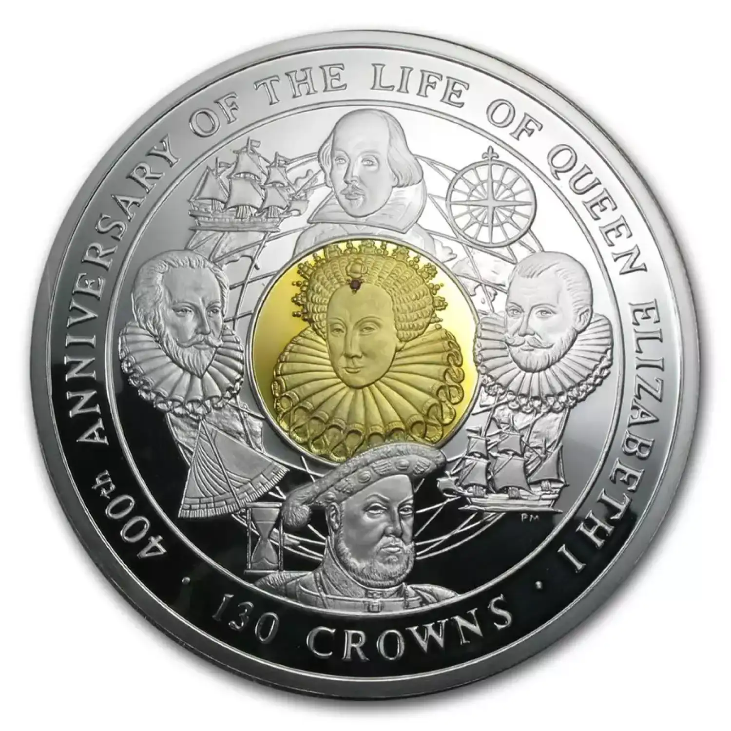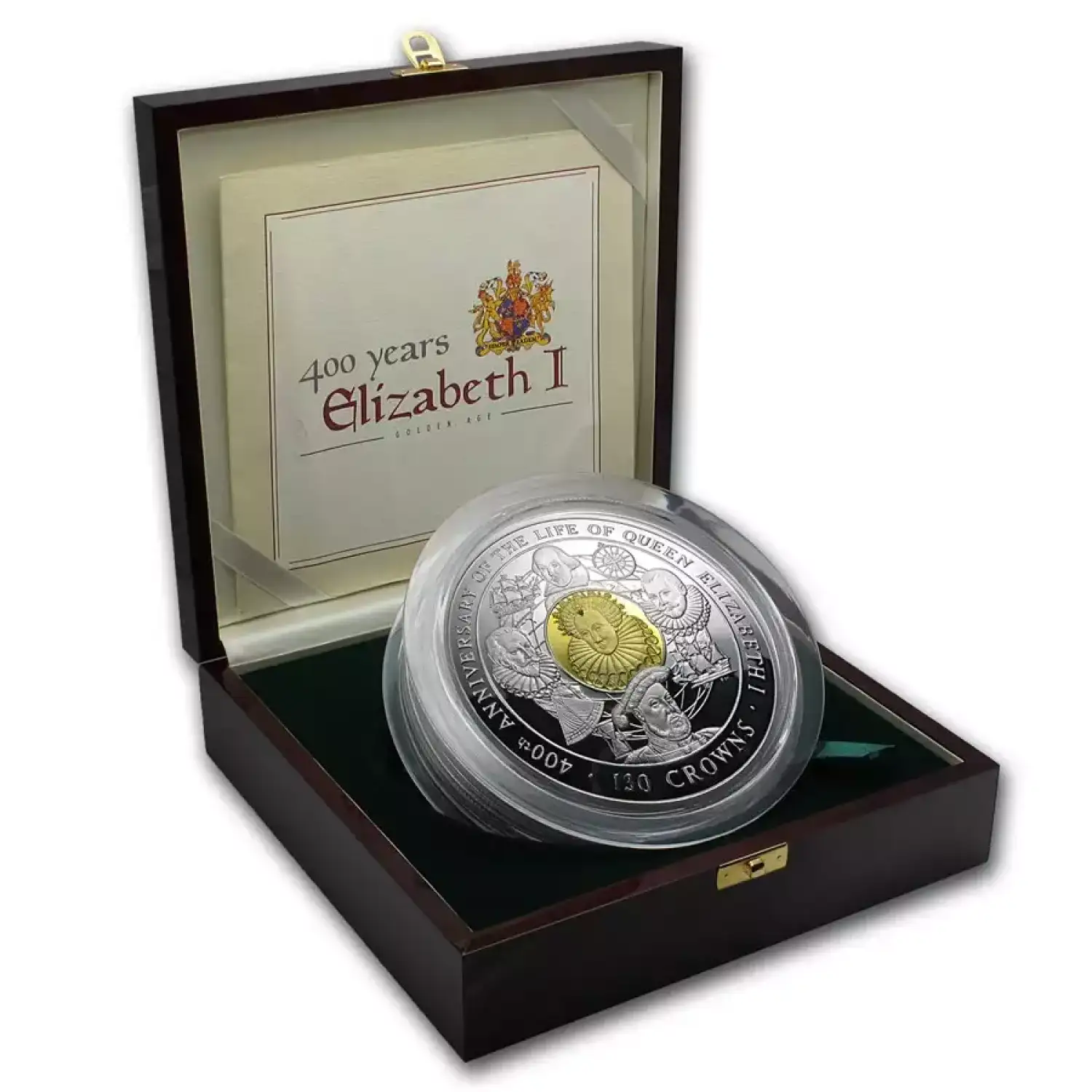 This stunning 4 kilo Silver coin with Gold accents and a ruby inlay pays tribute to the 400th anniversary of Queen Elizabeth I, daughter of Anne Boleyn and Henry VIII, and one of England’s most notable Monarchs.