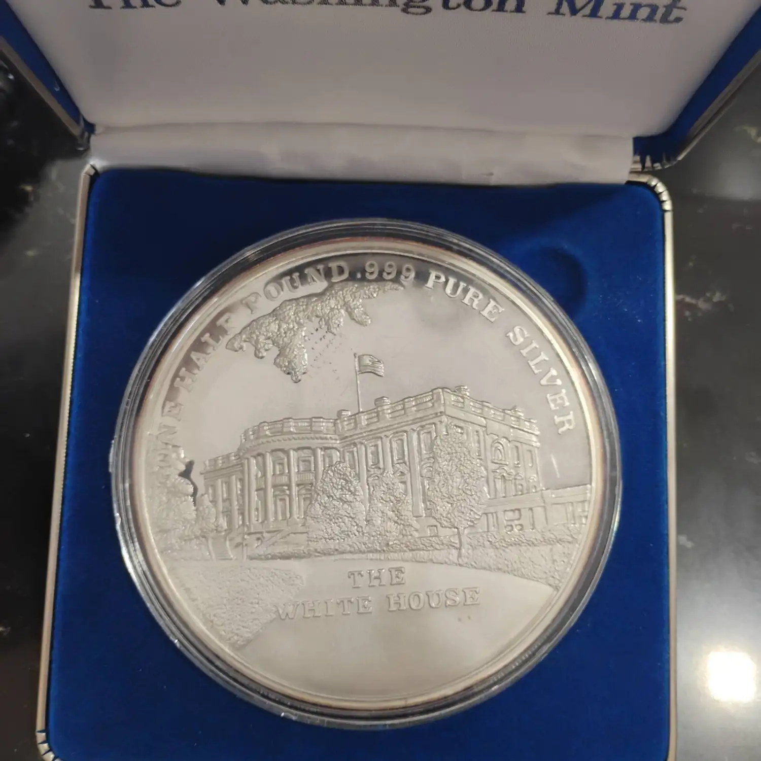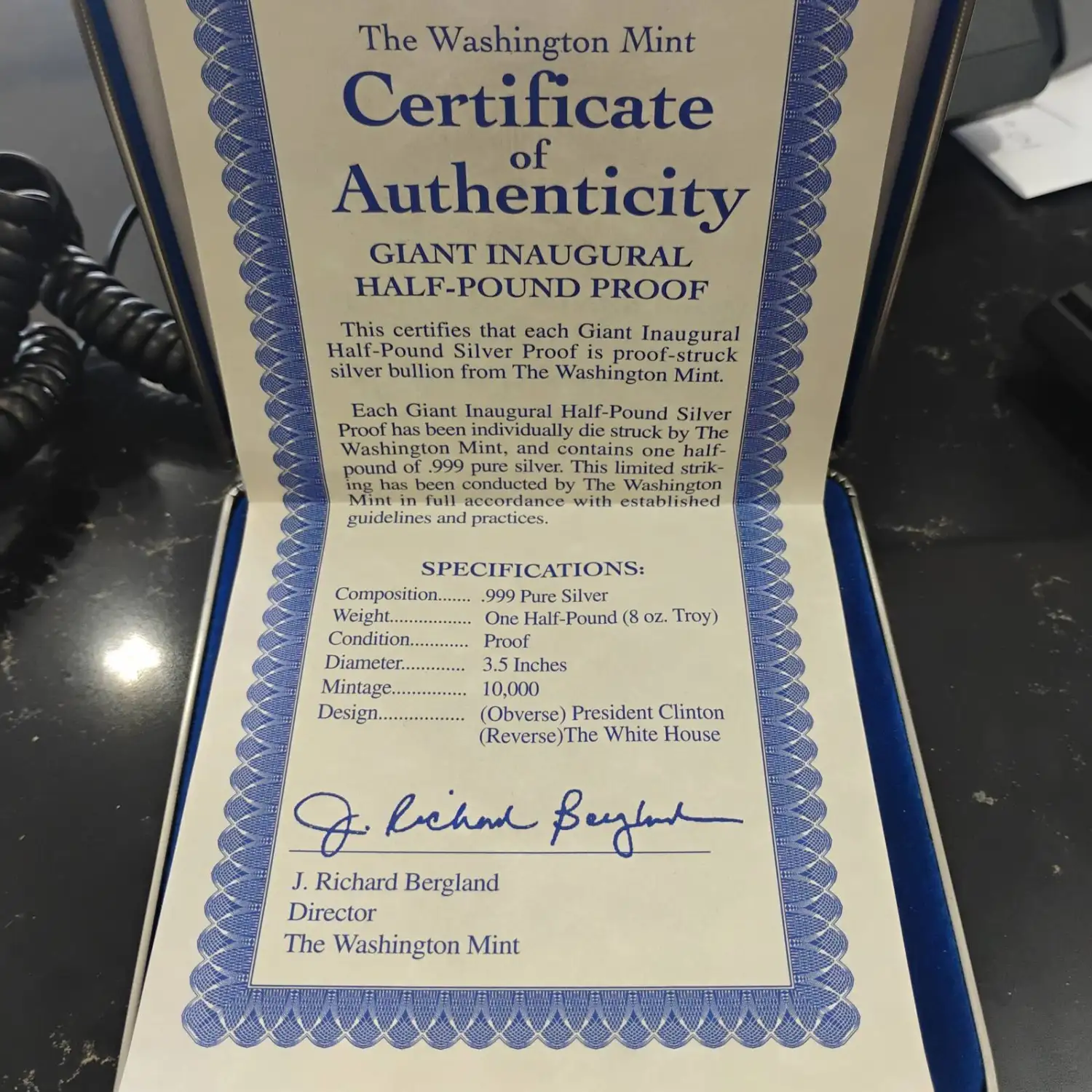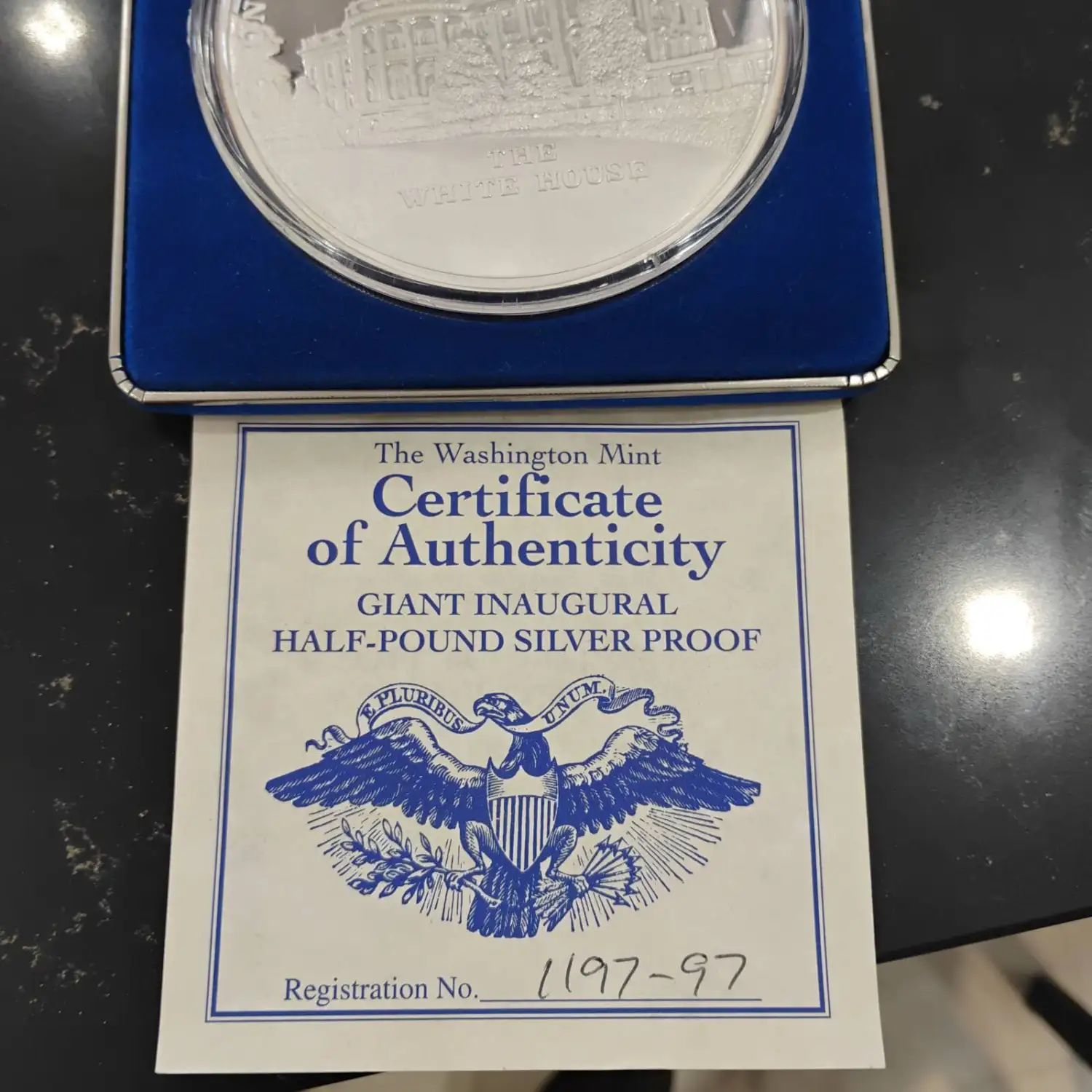 Featured in this listing is a highly collectible 1/2 pound President William Jefferson Clinton 1997 second inauguration .999 fine silver coin. This is a huge silver round that contains 8 Troy ounces of .999 silver, and has a 3.5"diameter. Please review the photos in this listing since it features the actual coin that will be received if you purchase this coin.