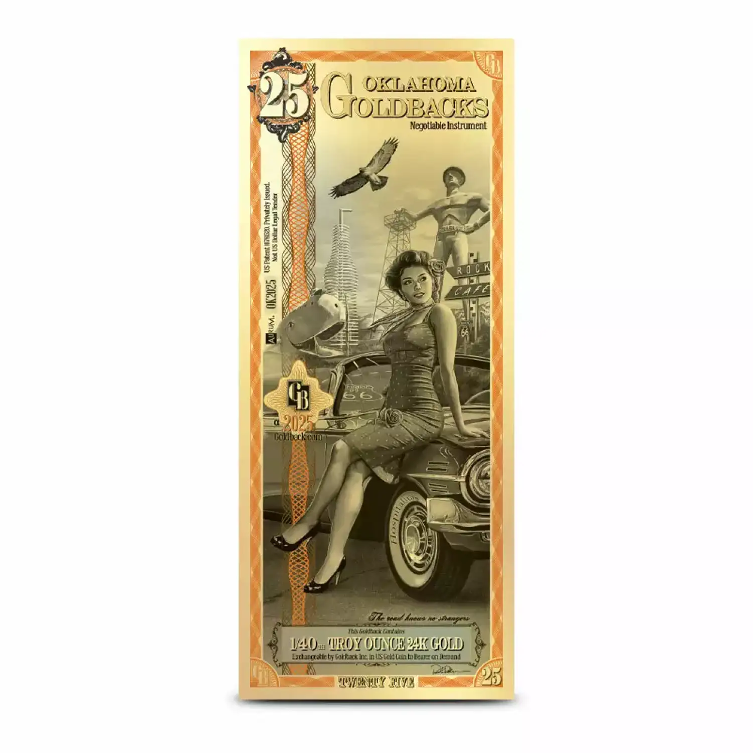The Oklahoma 25 Goldback shines a spotlight on the virtue of Hospitalitas—Hospitality, capturing the golden age of the American road trip through the lens of Oklahoma’s role along Route 66, the nation’s most iconic highway.