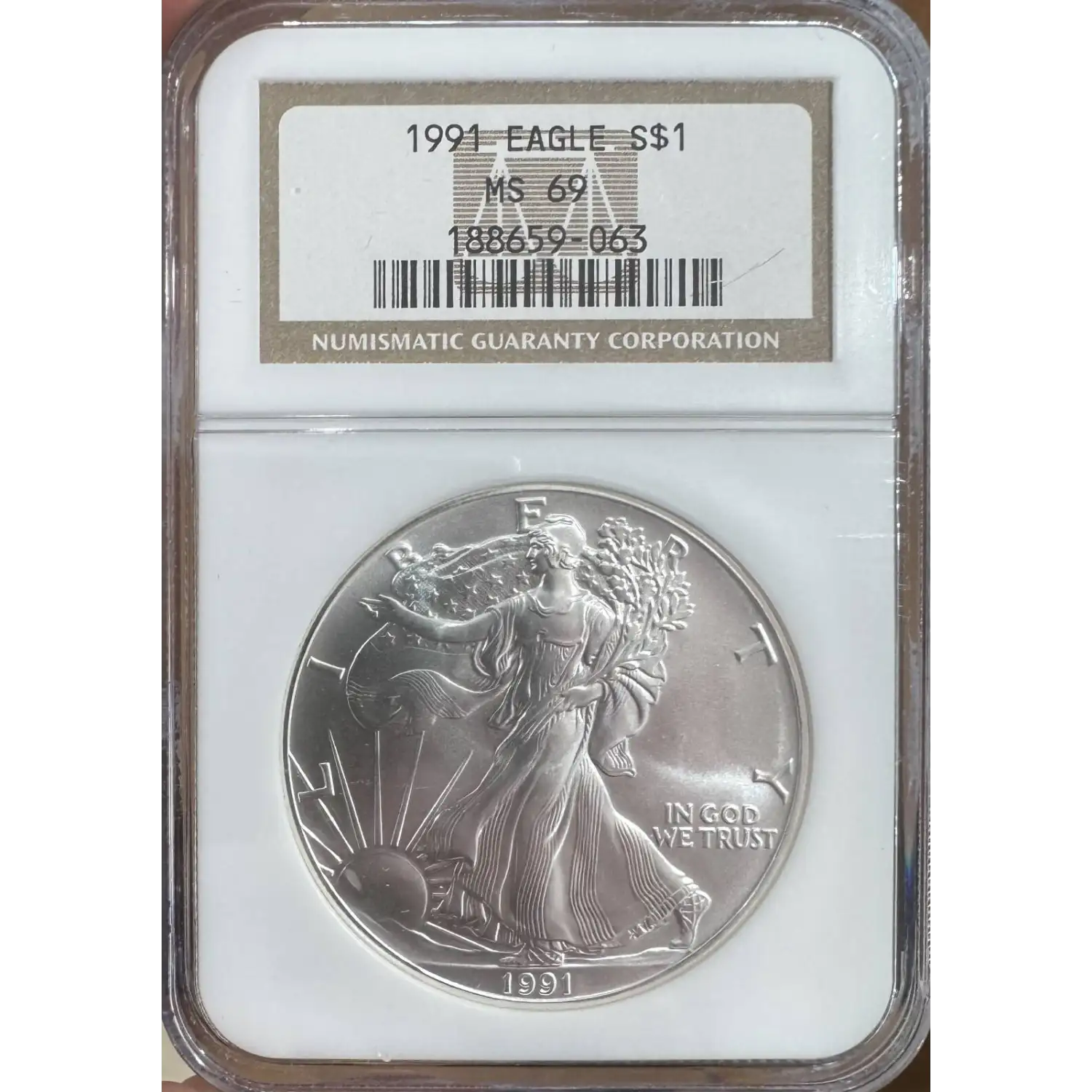 The 1991 One dollar is part of a series of Silver eagle coins struck from 1986-Present. The specific variety is Silver Eagle. Struck in Philadelphia and designated as a Business (MS) strike, this coin is made of 99.93% silver, 0.007% copper from a mintage of 7,191,066 struck.