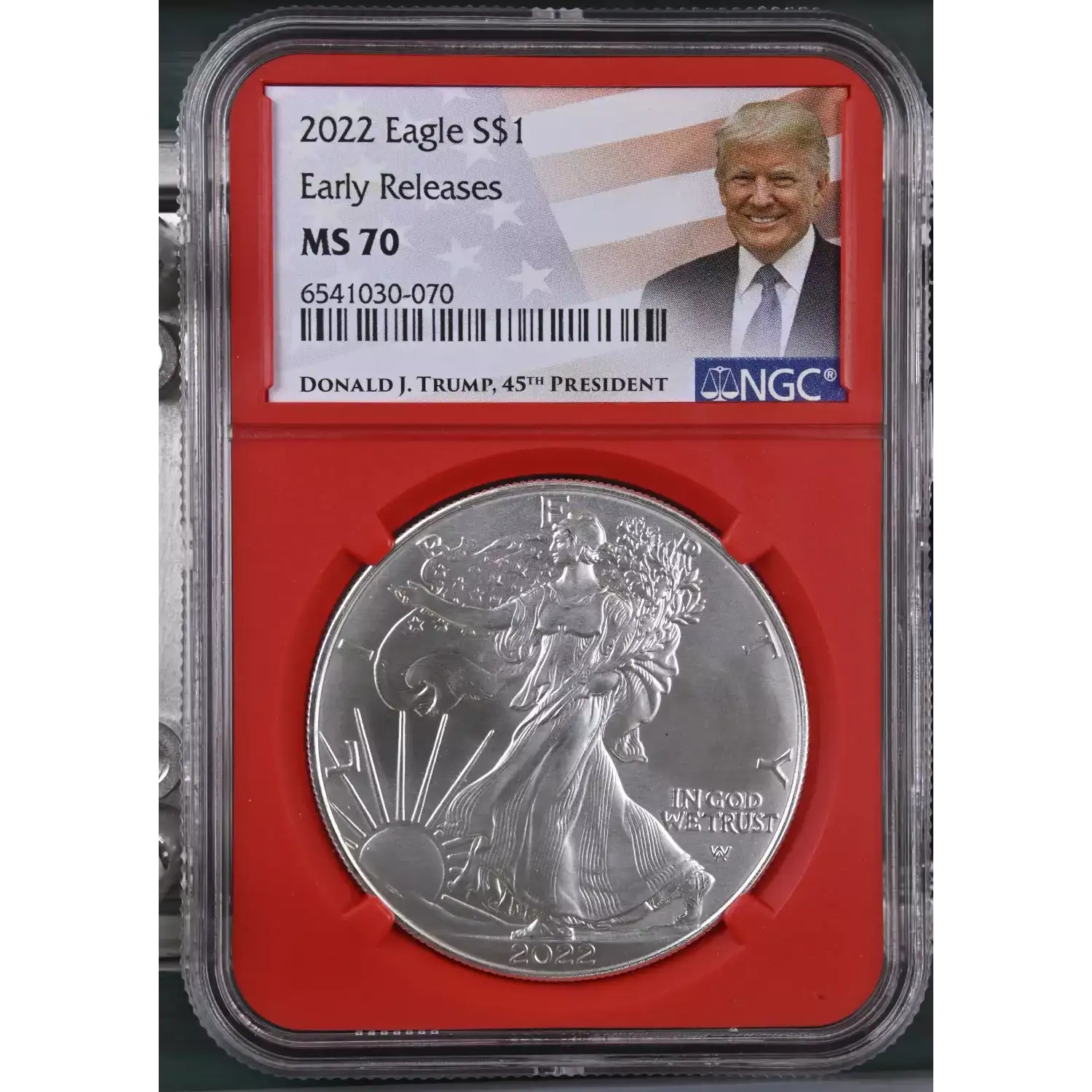 | Name | 2022 American Silver Eagle NGC MS70 Early Release (Red core/Trump Label) |