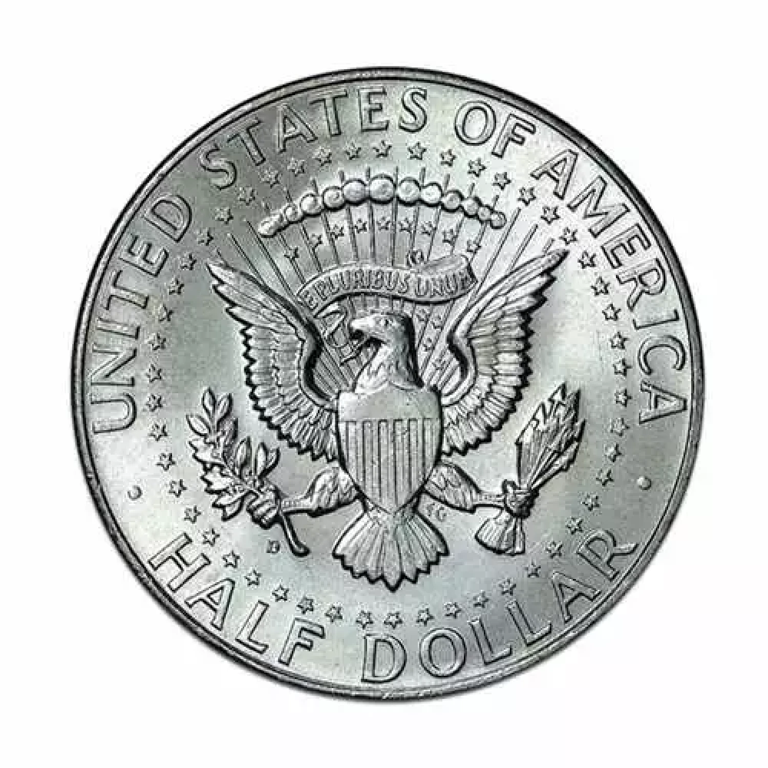 The reverse field of 90% Silver Kennedy Half Dollar coins features a modified version of the US Presidential Seal. Created by Frank Gasparro, this image features the heraldic eagle at its heart with the bird clutching the olive branch of peace in one talon and arrows of war in the other. The US heraldic shield is on its chest and a ring of 50 stars surrounds its figure.