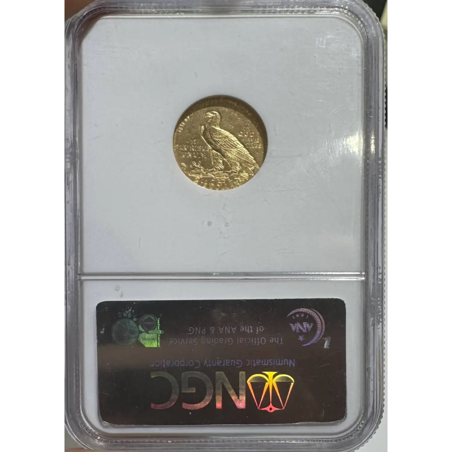 Reverse: The traditional American eagle struck incuse in the center with the words, UNITED STATES OF AMERICA at top, E PLURIBUS UNUM left of the eagle, and IN GOD WE TRUST to the right of the eagle. The denomination 2 1/2 DOLLARS struck below the eagle.