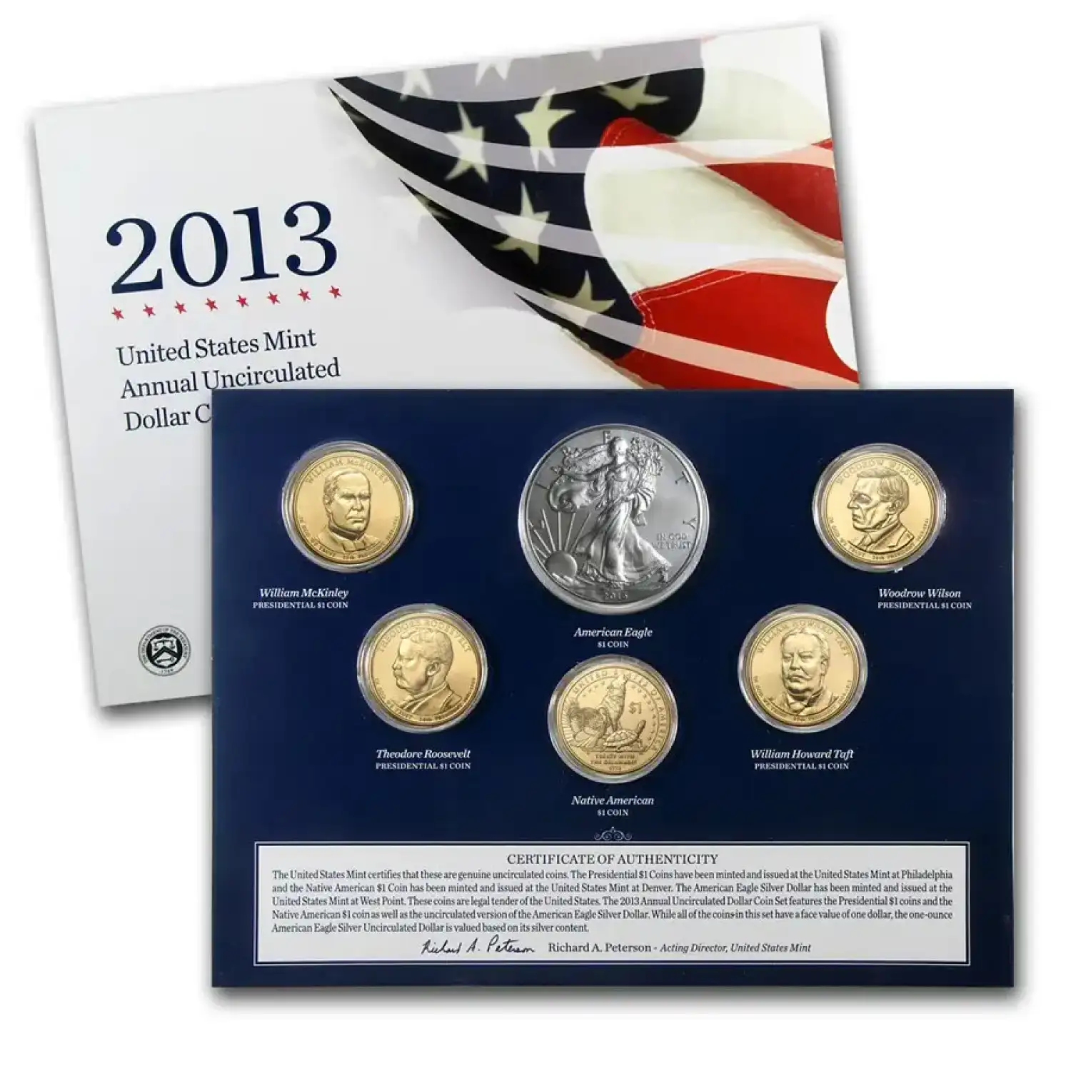 This set, produced by the U.S. Mint, features all 6 of the 2013 coins denominated as dollars: the Sacagawea dollar, four satin-finish Presidential Dollars and a burnished 2013-W Silver Eagle.