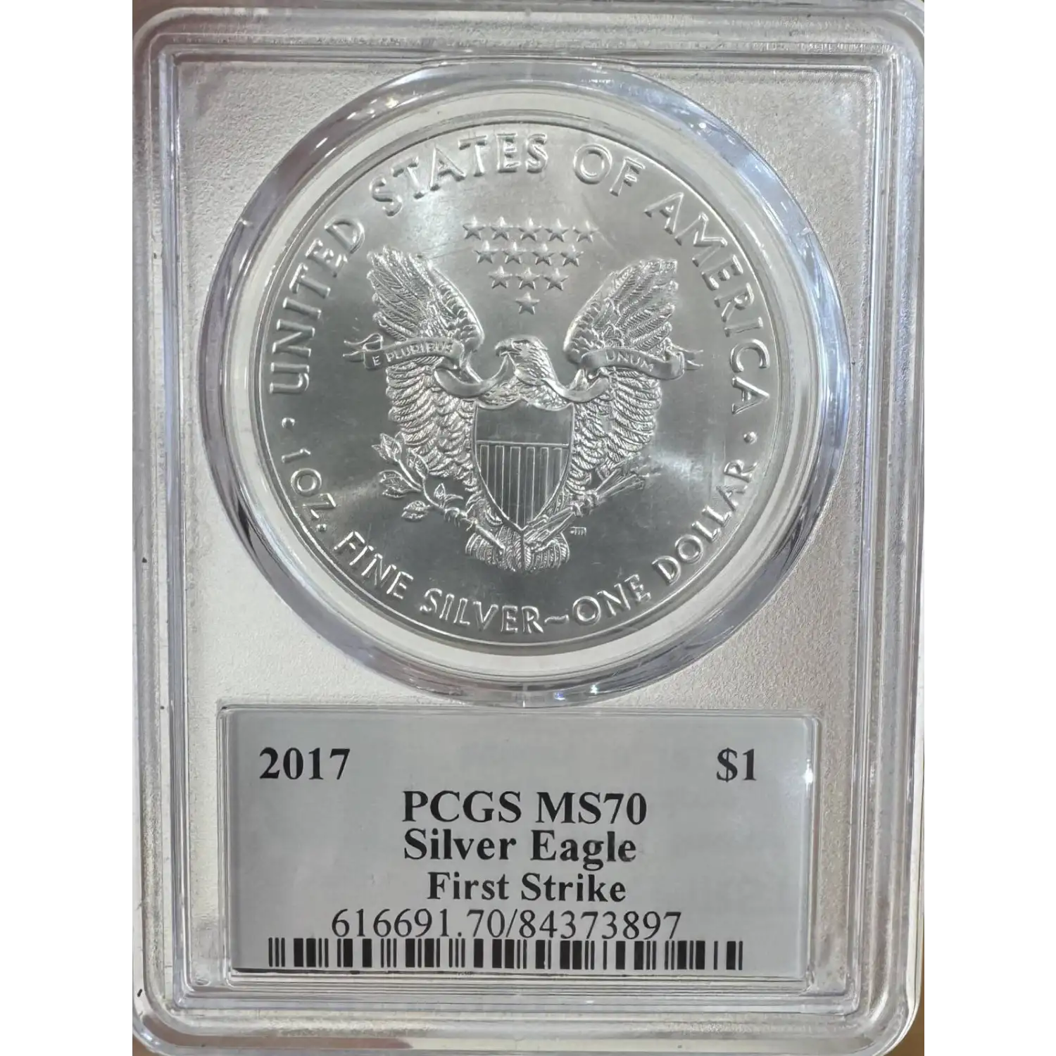 The 2017 One dollar is part of a series of Silver eagle coins struck from 1986-Present. The specific variety is Silver Eagle. Struck in Philadelphia and designated as a Business (MS) strike, this coin is made of 99.93% silver, 0.007% copper from a mintage of 18,065,500 struck.