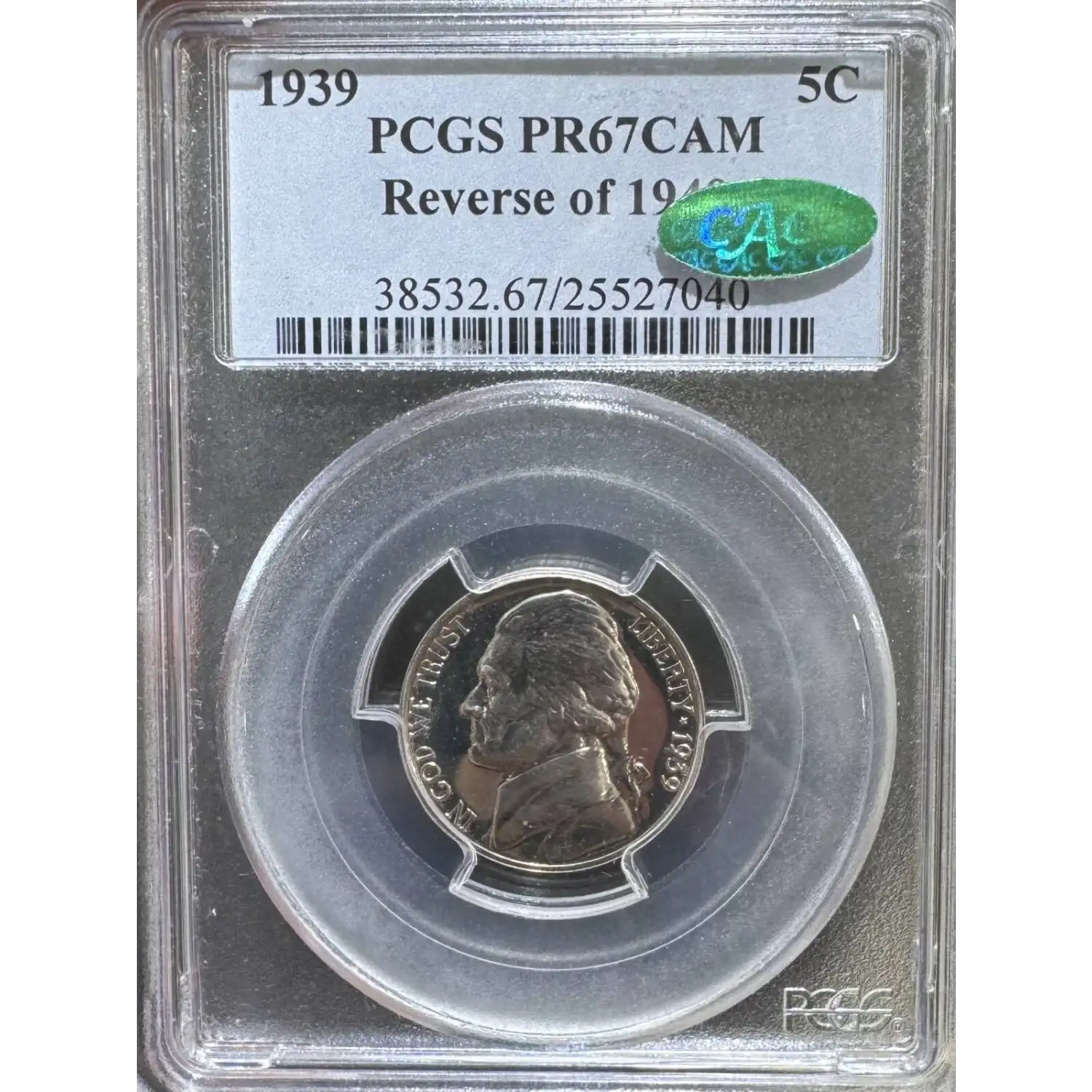 The 1939 5 Cents is part of a series of Jefferson nickel coins struck from 1938-Present. The specific variety is Reverse of 1940. Struck in Philadelphia and designated as a Proof (PR) strike, this coin is made of 75% copper; 25% nickel from a mintage of 12,535 struck.