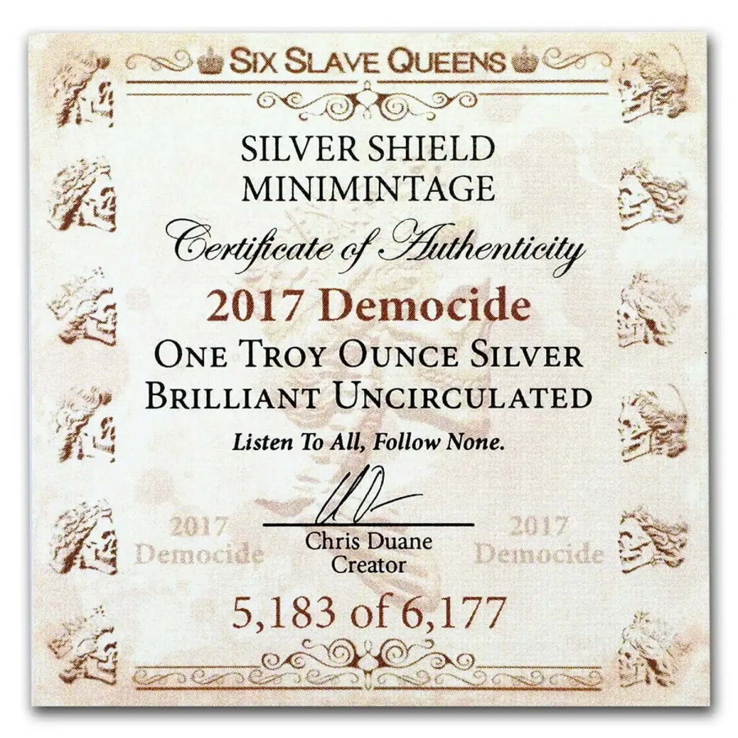 The 2017 Silver 1 oz Silver Shield Democide (Slave Queen) is the newest in the MiniMintage Silver Shield Collection. Limited to only 6,177 rounds, which makes for a great buy while adding a sense of collectibility to your stack!