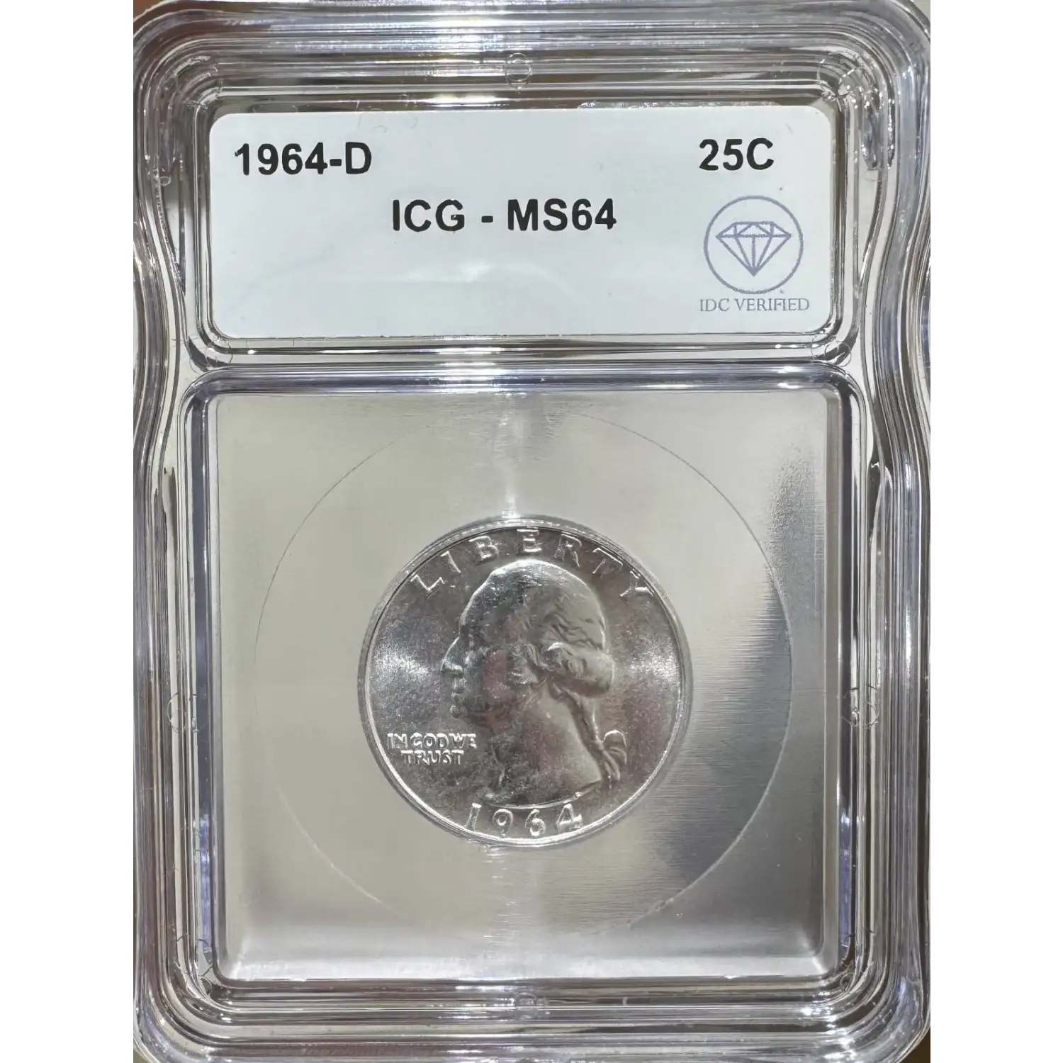 The 1964-D 25 Cents is part of a series of Washington quarter coins struck from 1932-1964. Struck in Denver and designated as a Business (MS) strike, this coin is made of 90% silver; 10% copper from a mintage of 704,135,528 struck.