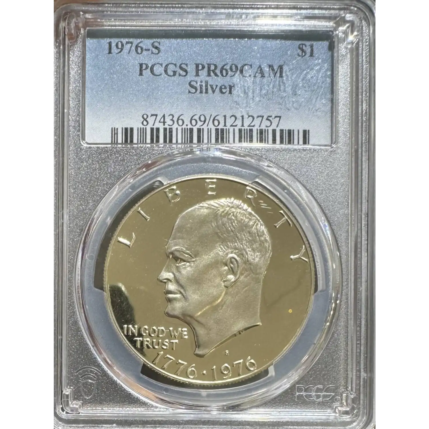The 1976-S One Dollar is part of a series of Eisenhower dollar coins struck from 1976. The specific variety is Clad. Struck in San Francisco and designated as a Proof (PR) strike, this coin is made of 75% copper; 25% nickel.
