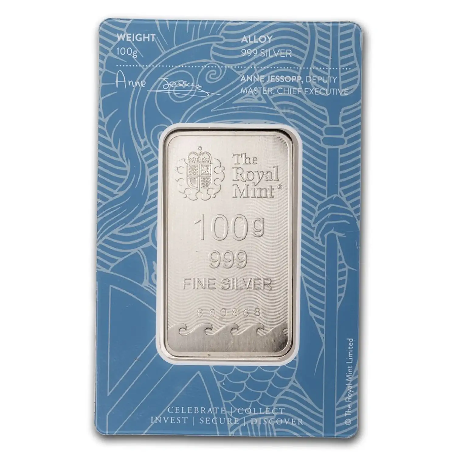 The iconic face of the Britannia has represented resilience and strength through the Ages, and now it makes her appearance on the first 100 gram silver Britannia bar, immortalized in .999 fine silver.