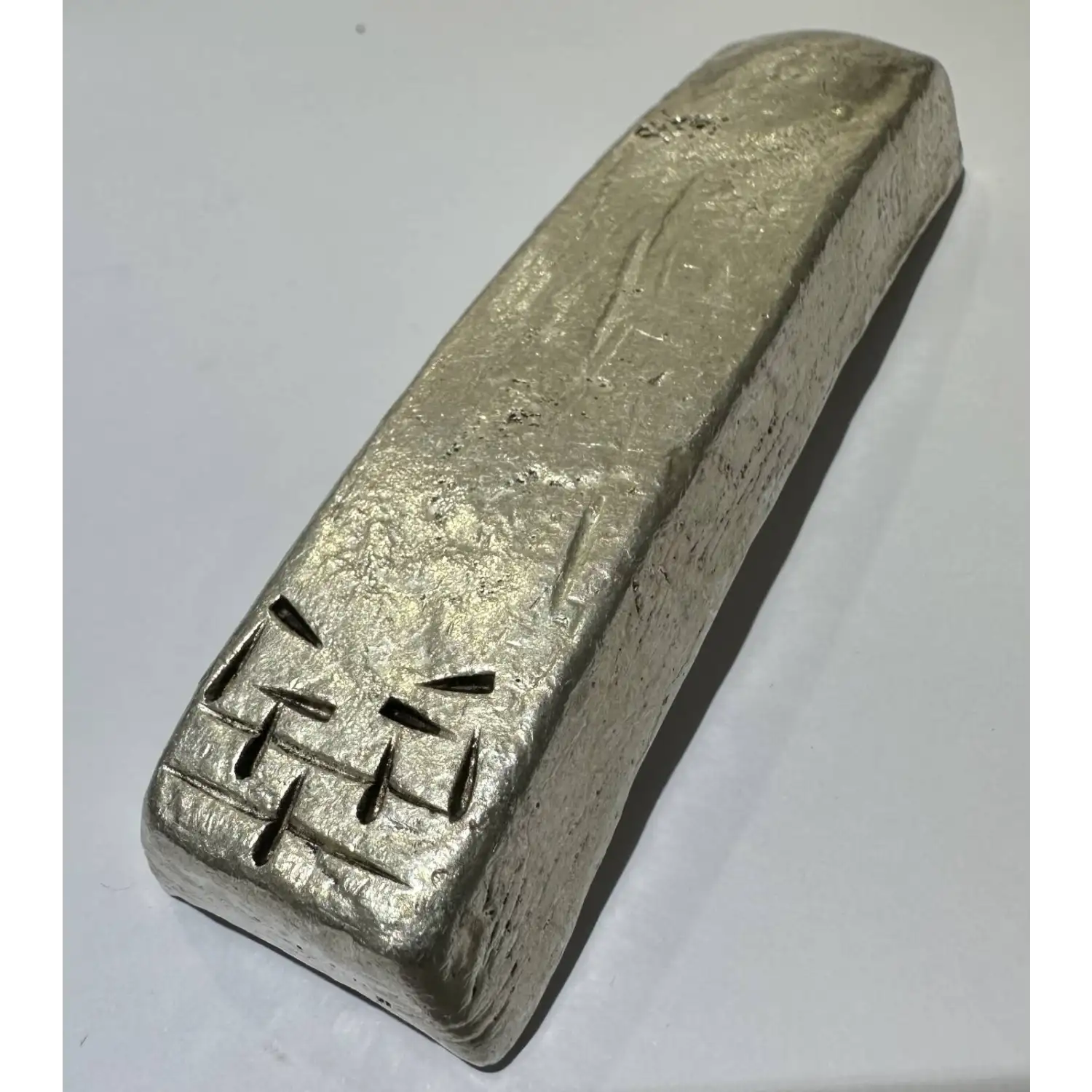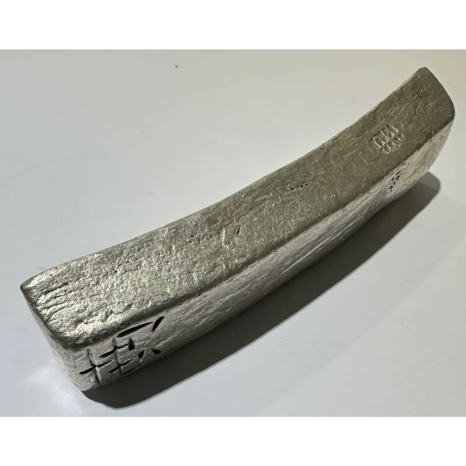 Cast mainly from melted Spanish-American 8 Reales, Indian Rupees, and French Indochina Piastres, they assay consistently .991 fine. A typical weight is generally in the 350-380 grams range, with a likely standard of 380 gm. The size is typically 110mm x 31mm x 14mm, except the early class which is longer and thinner.