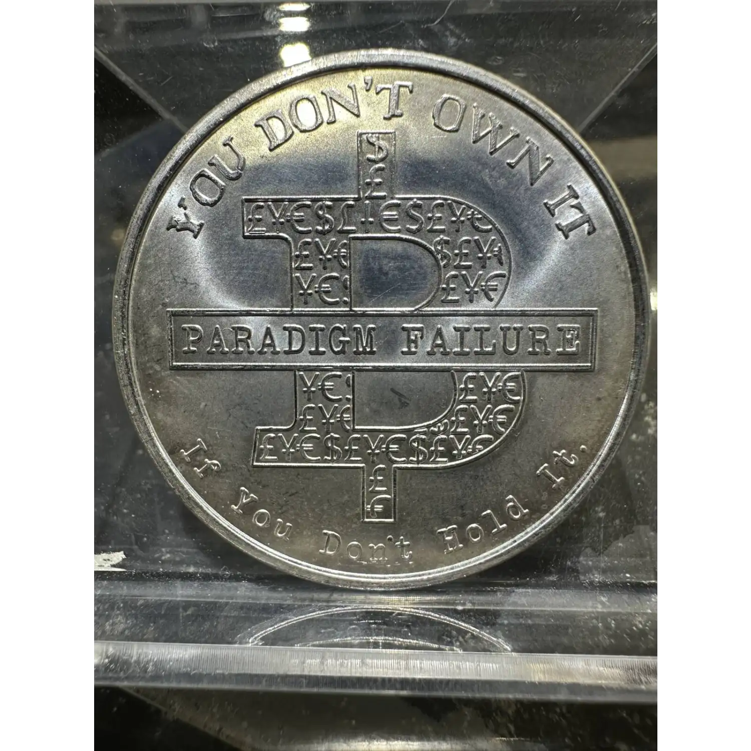 "YOU DON'T OWN IT - IF YOU DON'T HOLD IT" engraved around an outlined capital B (meant to bring Bitcoin to mind). Inside this symbol are symbols of different currencies, cleverly arranged to spell "eyes" and the words "Paradigm Failure" on top of it encircled.