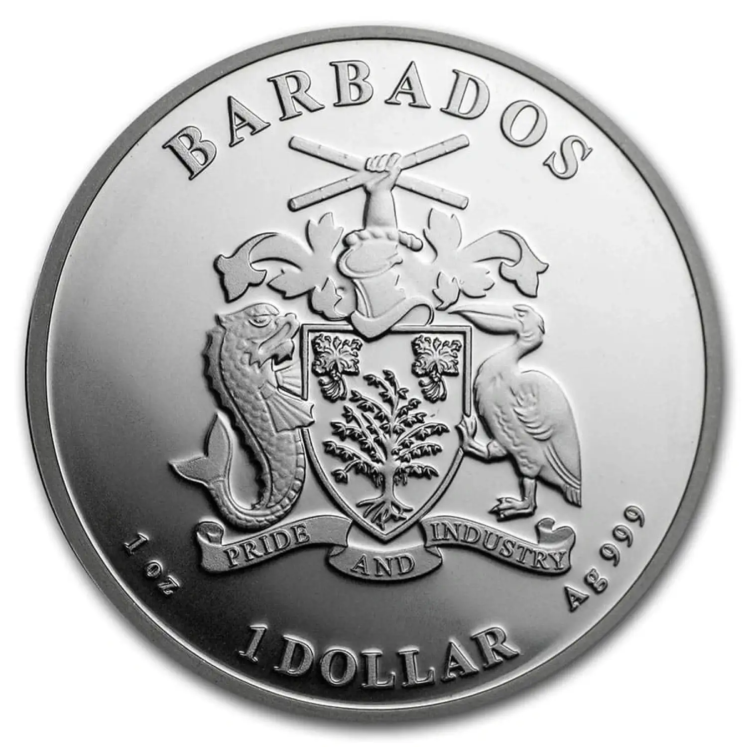 This bullion Silver coin issued by the country of Barbados features one of the icons featured in the Barbados Coat of Arms, the pelican . This coin has a limited mintage of 10,000 coins.